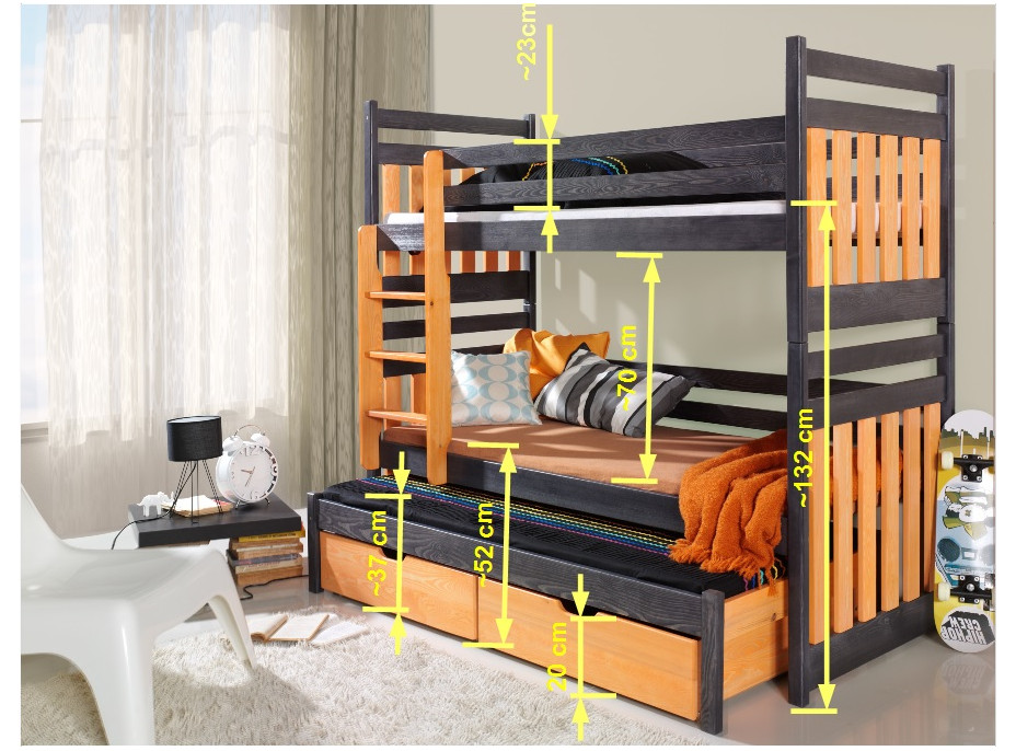 Maximálne odporúčané zaťaženie postele je 80 kg na horné lôžko, 120 kg spodné lôžko a 100 kg výsuvné lôžko. Konštrukcia postele je uspôsobená tak, aby zabránila pádu dieťaťa, a to vďaka ochranným bariéram. Vaše dieťa sa tak bude cítiť v pokoji a bezpečí. Súčasťou postele je pevný rebrík umiestnený na pravej alebo ľavej strane postele. Detská poschodová posteľ vytvára komplexný prvok, ktorý sa bude vynímať v každej detskej izbe. Poschodová posteľ SAMBOR nielenže šetrí miesto v izbe, ale zároveň poskytuje plnohodnotný priestor na spánok a odpočinok až troch detí.