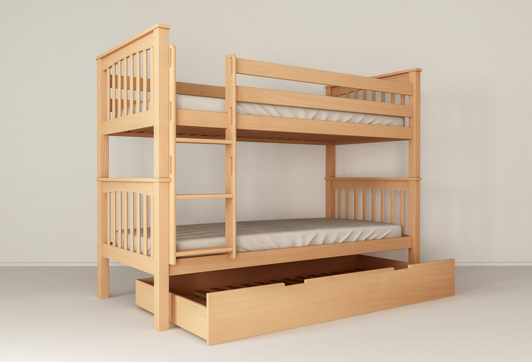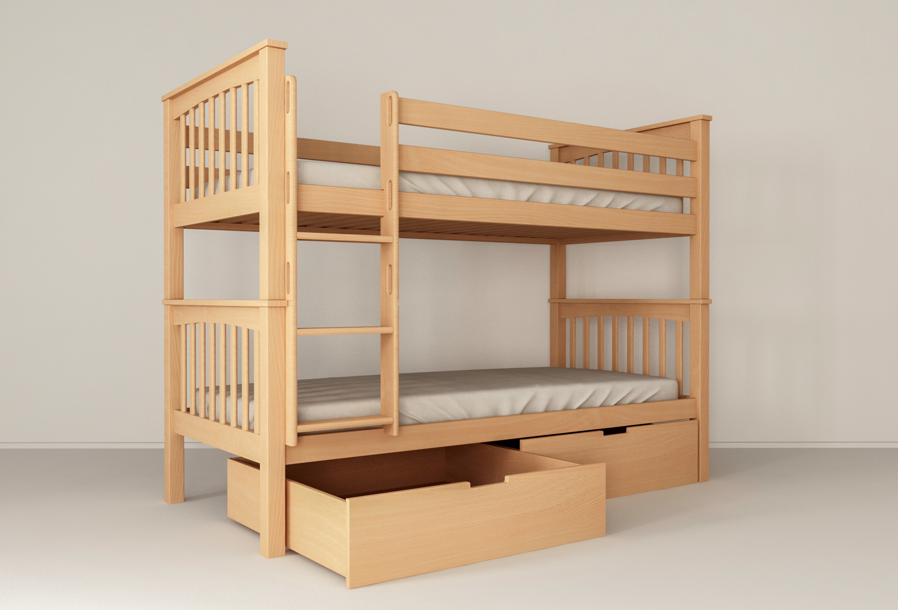 Detská posteľ je vyrobená z kvalitného masívu buk. Bukové drevo je veľmi obľúbené a vyhľadávané nielen pre svoj krásny vzhľad, ale hlavne pre tvrdosť a odolnosť. Vďaka svojim vlastnostiam teda bude posteľ dlhoročným spoločníkom a pri minimálnej údržbe môže slúžiť aj niekoľko generácií. Posteľ sa vyznačuje precíznym spracovaním na vysokej úrovni. Výrobok dodávame v prírodnej farbe buka ošetrený bezfarebným lakom alebo lakovaný bielou farbou.