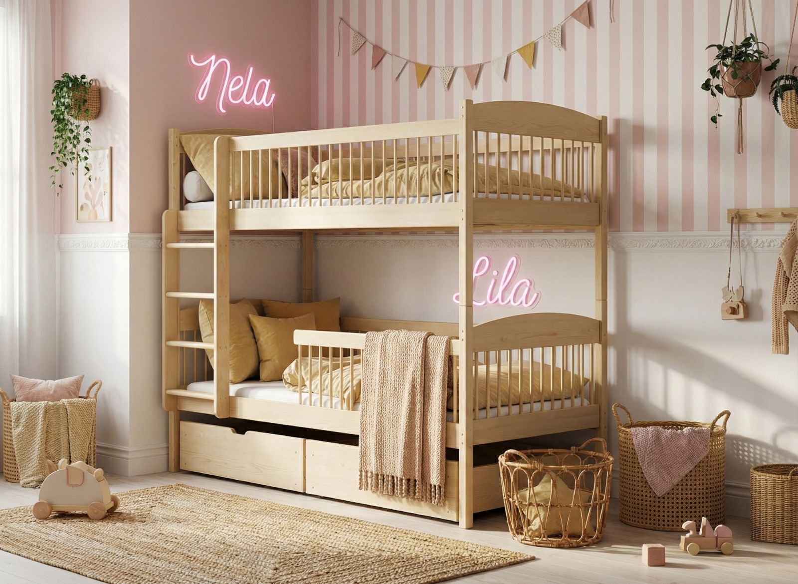 Detská poschodová posteľ z masívu so šuplíkmi ILONA - 200x90 cm - PRÍRODNÁ BOROVICA