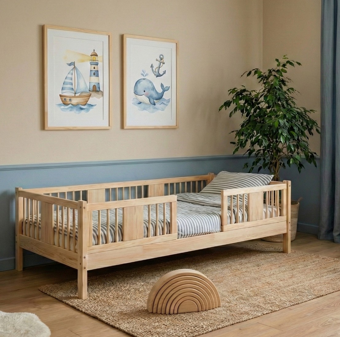 LUNA 10 cm je drevená detská posteľ s 10 cm zvýšeným roštom, ktorá kombinuje funkčnosť, estetiku a bezpečnosť. Jej decentný tvar so zaoblenými lamelami a prírodnými materiálmi z nej robí ideálnu voľbu pre škandinávsky štýl a izby inšpirované Montessori. Je to perfektná voľba pre rodičov, ktorí hľadajú prvú posteľ pre dieťa, ktorá zaistí pohodlný spánok a krásny interiér. Posteľ LUNA 10 je vyrobená výhradne z prírodného borovicového dreva o sile 2,2 cm, známeho pre svoju odolnosť a hrejivý, príjemný vzhľad. Všetky prvky sú hladko brúsené a zaoblené, čo zaisťuje úplnú bezpečnosť aj pre najmenšie deti. Povrchová úprava je prevedená ekologickými farbami na vodnej báze, ktoré spĺňajú európsku normu EN 71-3 – bez zápachu, toxínov a škodlivých látok. Vďaka tomu je posteľ LUNA 10 ideálna do izieb alergikov alebo dojčiat. Posteľ ponúkame aj vo verzii bez povrchových úprav - nelakované drevo. Vďaka tomu sa dá ľahko prispôsobiť - jej vzhľad môžete upraviť morením, lakovaním alebo maľovaním podľa vlastného uváženia. Každý prvok rámu bol precízne vyleštený a hrany sú jemne zaoblené, aby bolo zaistené maximálne pohodlie a bezpečnosť. Bezpečnostné zábrany pri vstupe do postele sú odnímateľné.