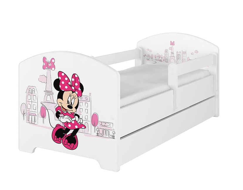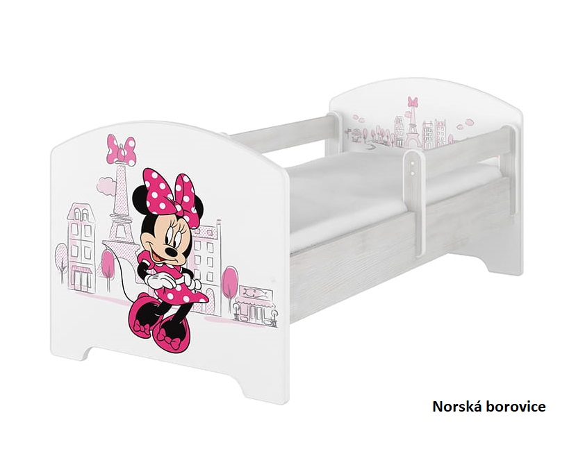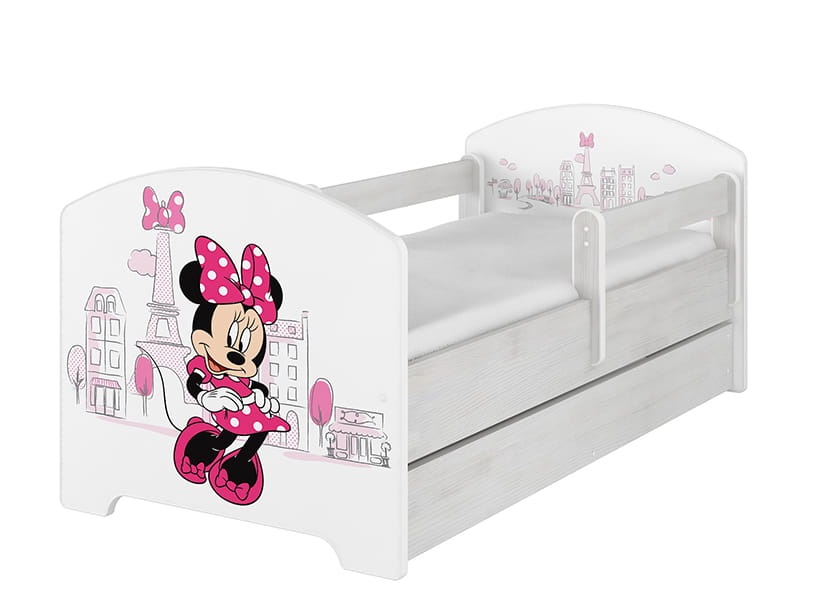 NA SKLADE: Detská posteľ Disney so šuplíkom - MYŠKA MINNIE PARIS 140x70 cm - nórska borovica + 1 dlhá a 1 krátka bariérka