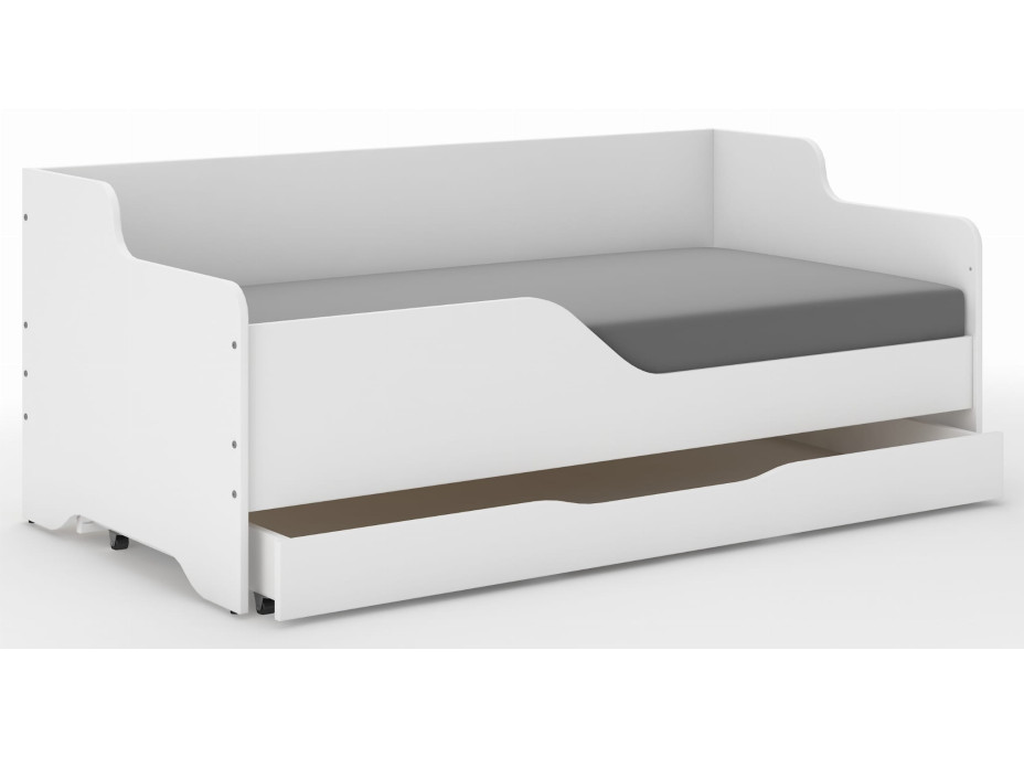 Detská posteľ z kolekcie LOLA na prvý pohľad zaujme moderným tvarom, ktorý si každé dieťa ihneď zamiluje. Vďaka svojim prednostiam sa hodí do každej detskej izby, kde ponúkne pohodlné obklopené spanie alebo využitie ako pohovku. Detské postele z našej ponuky sú vďaka použitým kvalitným materiálom veľmi odolné a pevné. Na bezpečnosť sa kladú veľké nároky a tak je posteľ v prevedení bez ostrých rohov a s vyvýšenou časťou bočnice , ktorá funguje ako bezpečnostná zábrana proti vypadnutiu z postele počas spánku. Odolnosť je zaistená vďaka pevnej konštrukcii z 18mm laminátových dosiek s PVC ochranou namáhaných hrán. Pod posteľou nájdete priestrannú zásuvku na 4 kolieskach, do ktorej schováte nielen posteľnú bielizeň, ale pokojne aj menšie hračky.