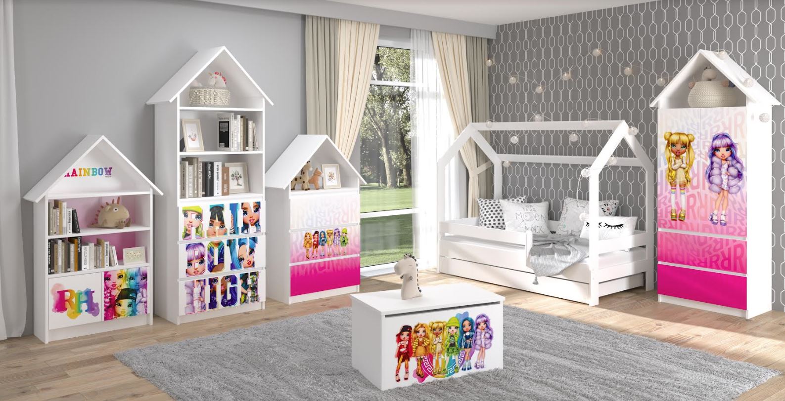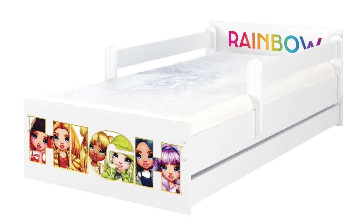 Táto posteľ s klasickým a jednoduchým dizajnom, zdobená obľúbenými postavičkami Rainbow High, sa stane štýlovým doplnkom každej dievčenskej izby. Je vyrobená z kvalitných lamino dosiek s hrúbkou 16 mm v bielej farbe. Obrázok na čele postele disponuje krásnymi sýtymi farbami, ktoré sú chránené špeciálnou ochranou proti oderu. Znížené čelo postele prináša nielen moderný dizajn, ale aj funkčnosť, čo je výhodné najmä v malých miestnostiach. Vďaka tomu môže dieťa ľahko vstúpiť do postele a vystúpiť z nej. Rošt postele je vyrobený z kvalitného borovicového dreva, vďaka čomu má nosnosť až 100 kg.