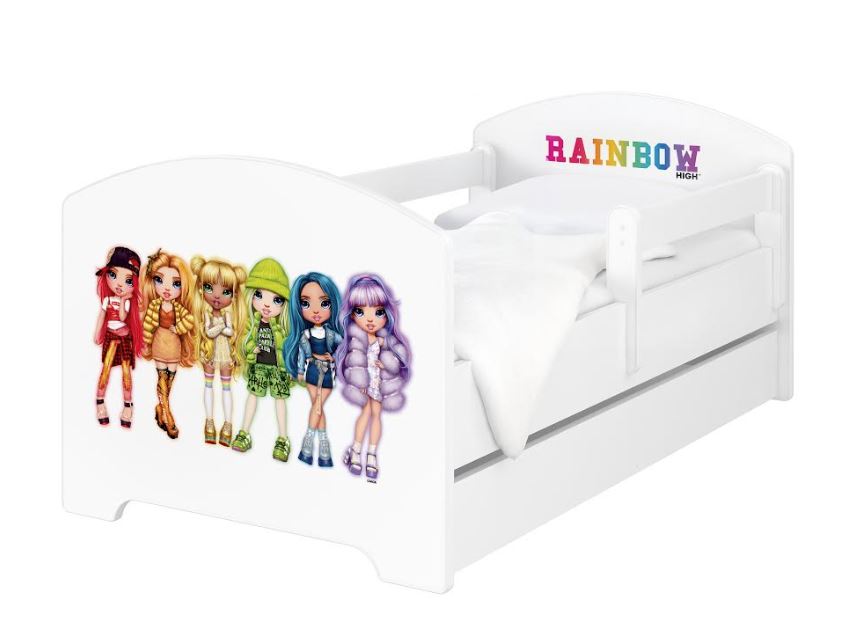 Detskú posteľ s motívom obľúbených postavičiek z kolekcie Rainbow High si určite zamiluje každé dievčatko! Posteľ je vyrobená z vysoko kvalitných lamino dosiek s hrúbkou 16 mm . Posteľ nadchne klasickým čistým zaguľateným vzhľadom s použitím detských zábran na oboch stranách postele, ktoré zaistia bezpečie pre vaše dieťa. Motív na detskej posteli je vyhotovený z ekologických a nezávadných farieb, ktoré neohrozujú zdravie dieťaťa. Pevnosť a stabilita detskej postele je daná silným rámom s overenou konštrukciou, ale aj roštom, ktorý je vyrobený z borovicového dreva.