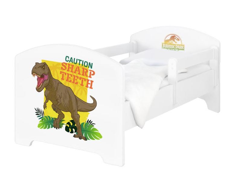 Každé dieťa si určite zamiluje túto detskú posteľ s motívom dinosaura. Posteľ je vyrobená z vysoko kvalitných lamino dosiek s hrúbkou 16 mm, čo zaručuje jej pevnosť a stabilitu. Má klasický čistý zaguľatený vzhľad a je vybavená detskými zábranami na oboch stranách, ktoré poskytujú bezpečie vášmu dieťaťu. Motív na posteli je vytvorený pomocou ekologických a nezávadných farieb, ktoré sú šetrné k zdraviu dieťaťa. Rám postele je silný a má overenú konštrukciu, pevný rošt je vyrobený z borovicového dreva.