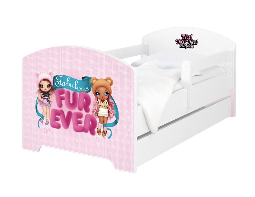Táto detská posteľ s motívom obľúbených postavičiek z kolekcie Na! Na! Na! Surprise! určite nadchne každé dievčatko! Je vyrobená z vysoko kvalitných lamino dosiek s hrúbkou 16 mm, čo zaručuje jej pevnosť a stabilitu. Jej dizajn má klasický a čistý zaguľatený vzhľad, a je vybavená detskými zábranami na oboch stranách, ktoré zaistia bezpečie vášmu dieťaťu. Motív na posteli je vytvorený pomocou ekologických a nezávadných farieb, ktoré sú šetrné k zdraviu dieťaťa. Rám postele je silný a má overenú konštrukciu, pevný rošt je vyrobený z borovicového dreva.