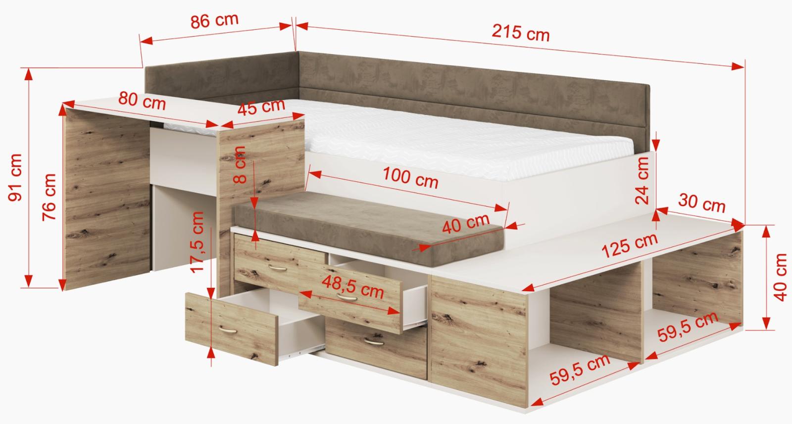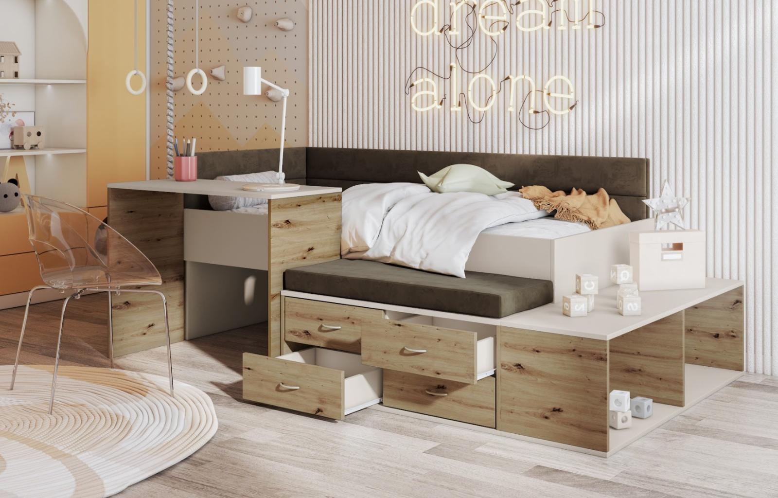 Hlavná konštrukcia postele AMIRA je vyrobená z nábytkovej dosky v kašmírovej farbe, čo zaisťuje univerzálny a esteticky príjemný vzhľad, ktorý doplní každú detskú alebo tínedžerskú izbu. Farba doplnkov v dekore duba artisan tvorí príjemnú a nevšednú kombináciu, ktorá sa hodí do rôznych druhov moderných interiérov. Praktické zásuvky a funkčný písací stôl robia z postele perfektnú voľbu pre potreby detí školského veku. Zásuvky sú ideálne na uloženie zošitov, kníh a školských potrieb a pomáhajú udržiavať poriadok, zatiaľ čo písací stôl vytvára pohodlné miesto pre štúdium, domáce úlohy a koníčky. Toto riešenie podporuje samostatnosť dieťaťa a uľahčuje každodennú organizáciu. Ďalšou výhodou je pohodlné čalúnené sedadlo a bočné panely v hnedej farbe. To dodáva nábytku nielen funkčnosť, ale aj útulný pocit. Mäkké čalúnenie chráni pred chladom steny a zvyšuje pohodlie počas odpočinku. Súčasťou sady je aj rám z pevných lamiel, ktorý poskytuje dostatočnú oporu matraca, štrukturálnu stabilitu a pohodlný spánok.