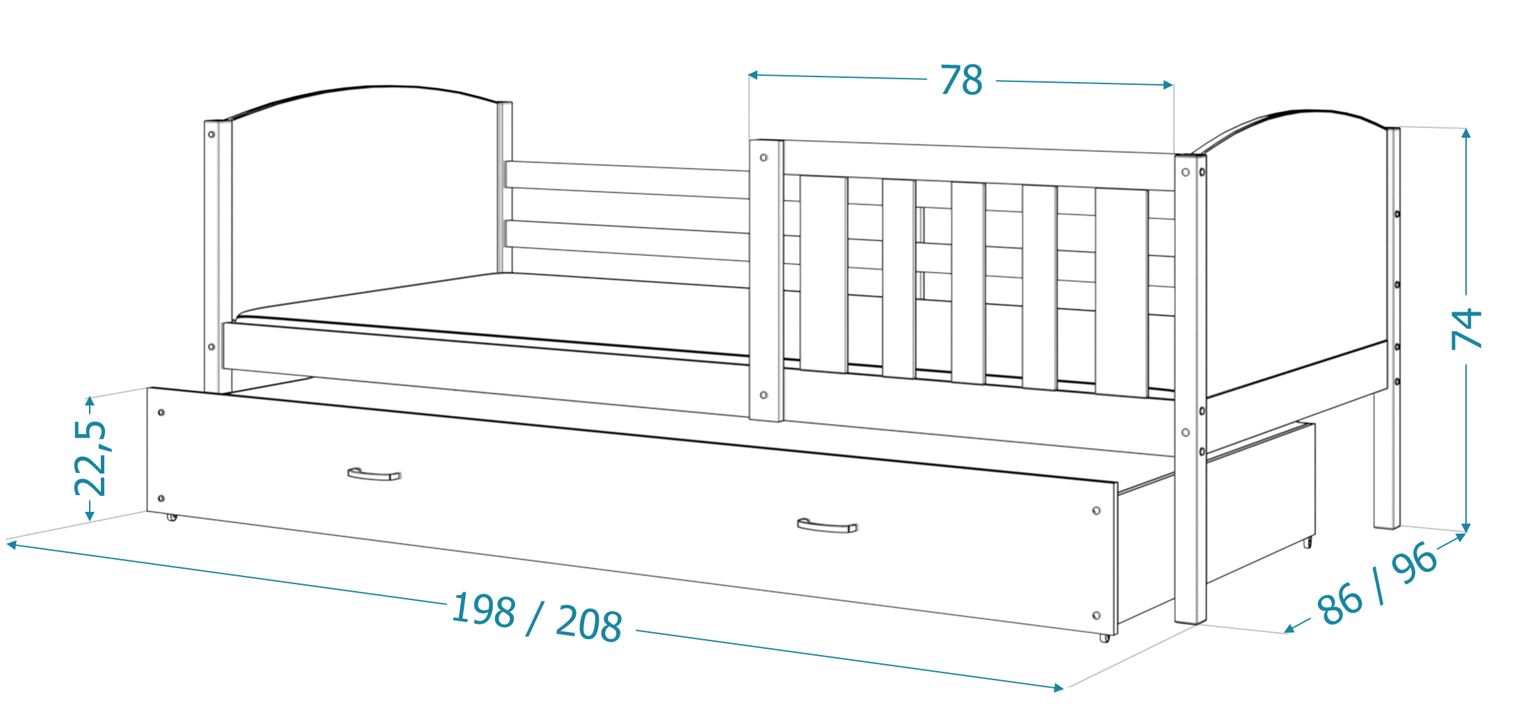 Rozmery postele: 208x96 cm, ložná plocha pre matrac 200x90 cm.