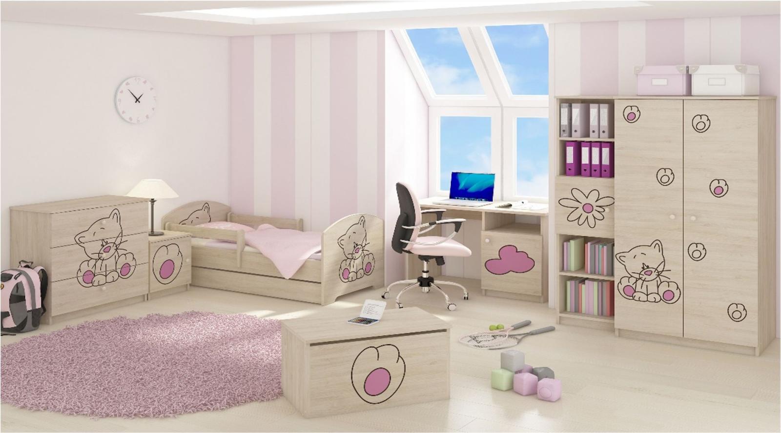 Detská posteľ s výrezom ružová MAČIČKA 140x70 cm, dub sonoma + 2x krátka zábrana, šuplík, matrac