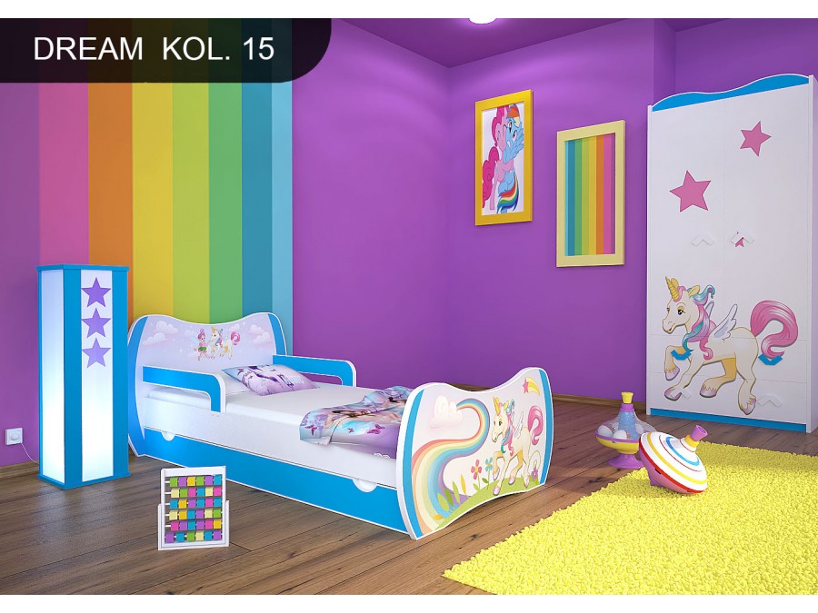 Detské postele DREAM s najobľúbenejšími rozprávkovými vzormi spoľahlivo rozžiari izbičky chalanov aj dievčatiek. Z našej širokej ponuky pestrých veselých motívov si iste vyberiete a vytvoríte tak vášmu dieťaťu izbičku snov, kde bude radosť učiť sa, hrať sa aj spať. Postele sú vyrobené z vysoko kvalitnej nábytkovej lamino dosky so zaoblenými hranami, aby bolo dieťa chránené pred zranením. Z oboch strán lôžka sú pevné zábrany, ktoré chránia vaše dieťa pred prípadným pádom z postele. Na čelách postele je krásny farebná potlač, ktorý sa vášmu dieťaťu určite zapáči. K tlačeniu obrázkov boli použité ekologické farby, spĺňajúci najprísnejšie zdravotne bezpečnostné normy. Štandardne k posteli dodávame lamelový rošt a penovou matrac so snímateľným prateľným poťahom ZADARMO! Šuplík pod posteľou je možné jednoducho vysunúť pomocou gumových koliesok, takže manipuláciu s ním ľahko zvládne aj dieťa. Praktický šuplík môže byť použitý na uloženie detských hračiek, lôžkovín alebo iných predmetov.