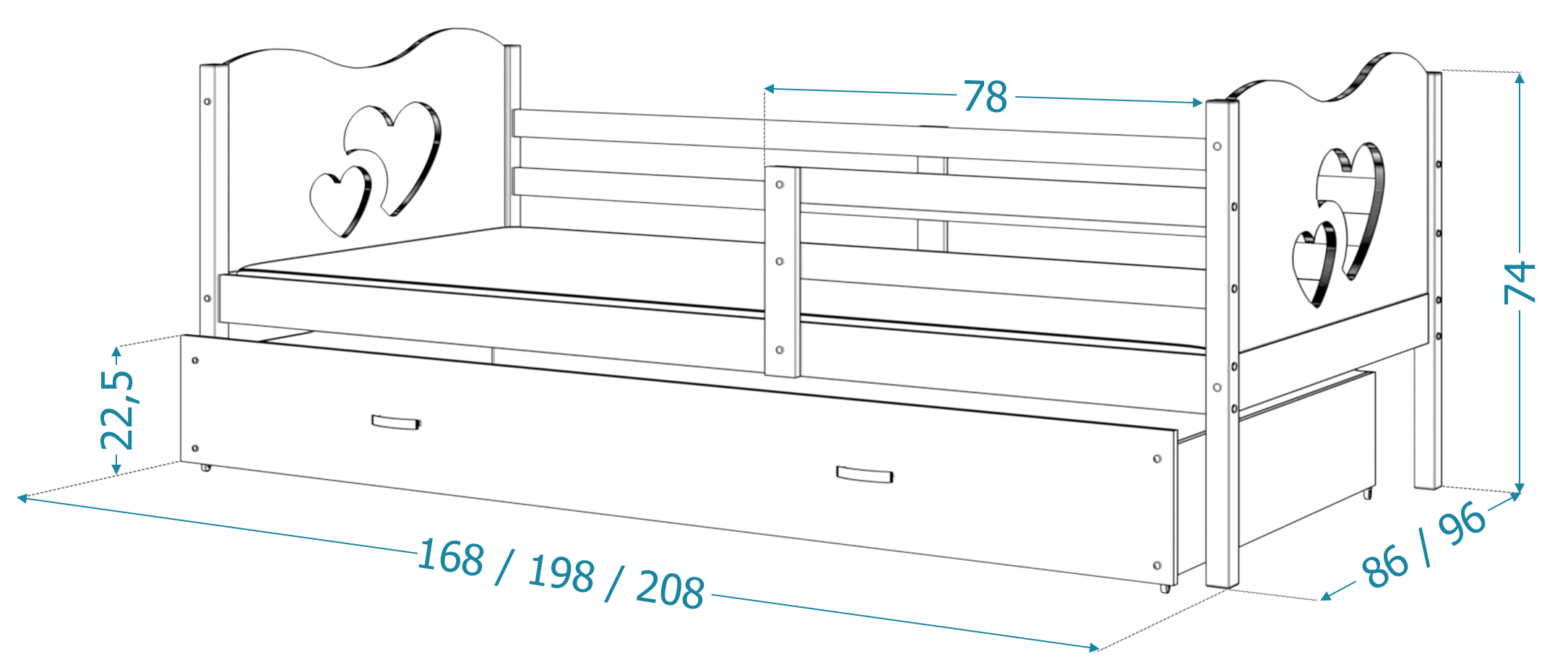 Táto detská posteľ je vytvorená tak, aby ušetrila priestor v detskej izbe. Disponuje jedným lôžkom a zásuvkou na kolieskach, čo umožní ľahké zasunutie šuplíku pod posteľ. Konštrukcia postele je prispôsobená tak, aby zabránila pádu dieťaťa, a to vďaka ochranným bariéram. Vaše dieťa sa tak bude cítiť v pokoji a bezpečí. Detská posteľ zaujme vyrezanými vzory po stranách a vytvára tak komplexný prvok, ktorý sa bude vynímať v detskej izbe.