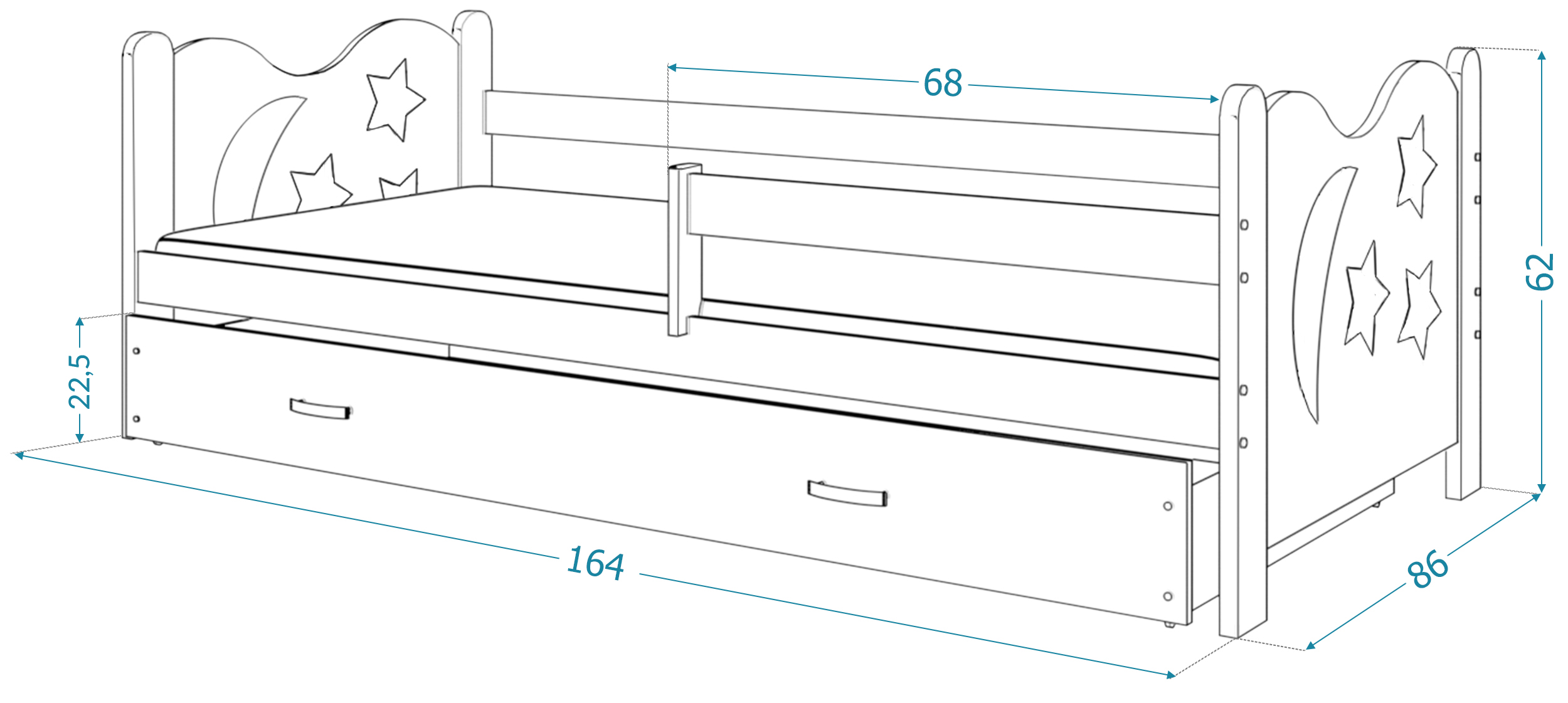 Táto detská posteľ je vytvorená tak, aby ušetrila priestor v detskej izbe. Disponuje jedným lôžkom a zásuvkou na kolieskach, čo umožní ľahké zasunutie šuplíku pod posteľ. Konštrukcia postele je prispôsobená tak, aby zabránila pádu dieťaťa, a to vďaka ochranným bariéram. Vaše dieťa sa tak bude cítiť v pokoji a bezpečí. Detská posteľ zaujme vyrezanými vzory po stranách a vytvára tak komplexný prvok, ktorý sa bude vynímať v detskej izbe.