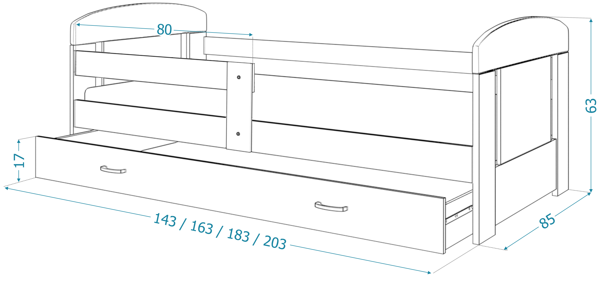 Rozmery postele: 163x85x63 cm, ložná plocha pre matrac 160x80 cm.