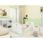 Zábrana na bokoch postele chráni dieťa pred pádom z postele počas spánku. Bariérku je možné podľa potreby jednoducho odmontovať alebo dať na druhú stranu. Precízne spracovanie a kvalita použitých materiálov zaisťuje, že každá detská posteľ je veľmi odolná a kvalitná. Ako praktický úložný priestor slúži pojazdná zásuvka na 4 gumových kolieskach. Posteľ je variabilná a je možné ju zostaviť na pravú aj ľavú stranu.