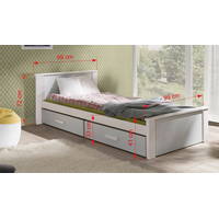 Detská posteľ z masívu borovice ALDA je skvelou voľbou, ak hľadáte kvalitnú a robustnú posteľ . Posteľ sa vyznačuje svojou praktickosťou a atraktívnym dizajnom . Rám postele je vyrobená z veľmi kvalitného borovicového dreva , ktoré je ošetrené tromi vrstvami ekologického laku v bielej akrylovej povrchovej úprave. Čelá postele a šuplíkov sú vyrobené z lamina s ABS hranami v modernom odtieni dub sonoma . Tým je zaistená vysoká odolnosť postele voči mechanickému poškodeniu a rôznym druhom nečistôt. Posteľ je dodávaná s dvoma priestrannými šuplíkmi na kolieskach, kam si môžete uložiť lôžkoviny, hračky alebo iné nevyhnutnosti.