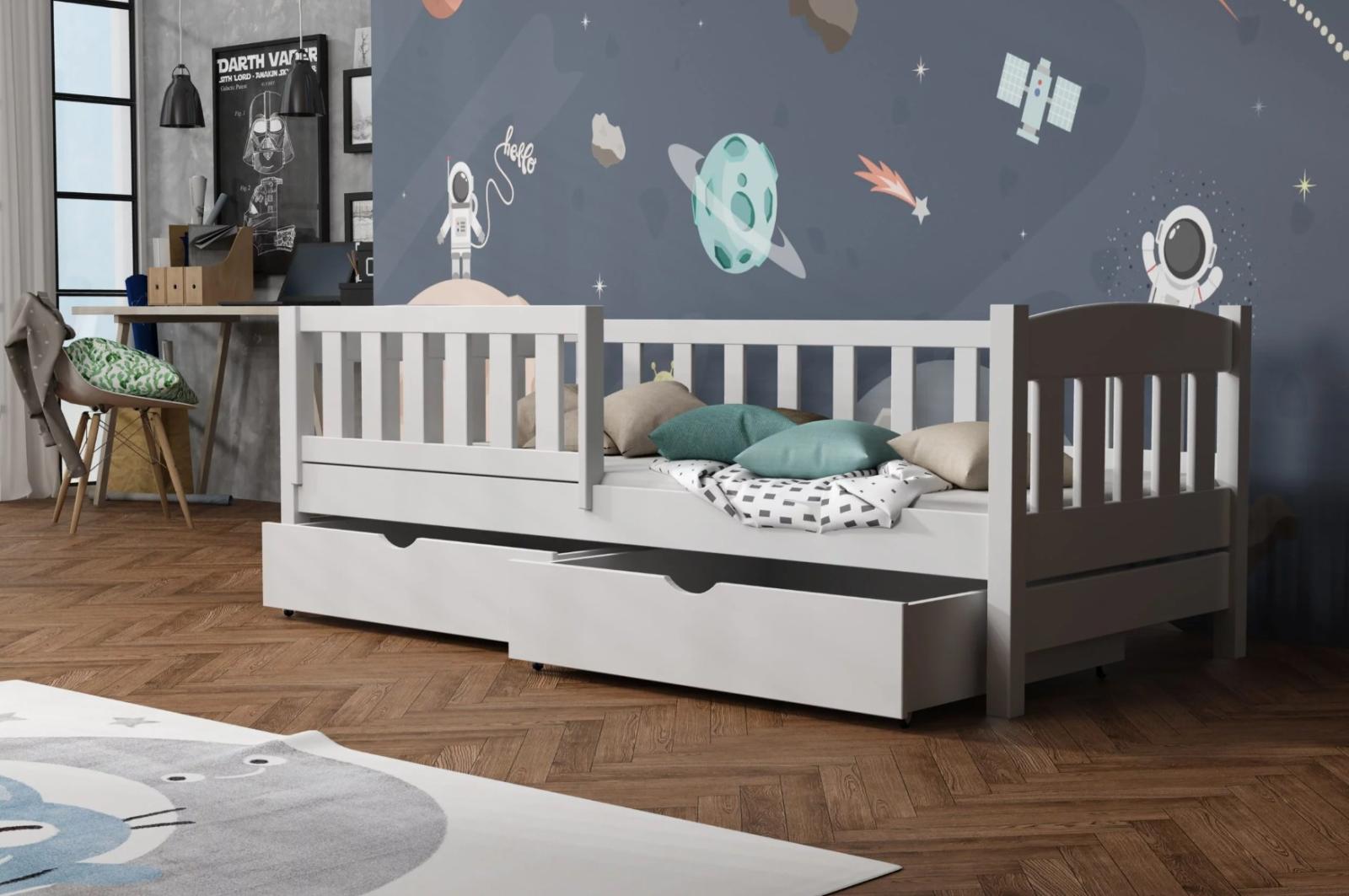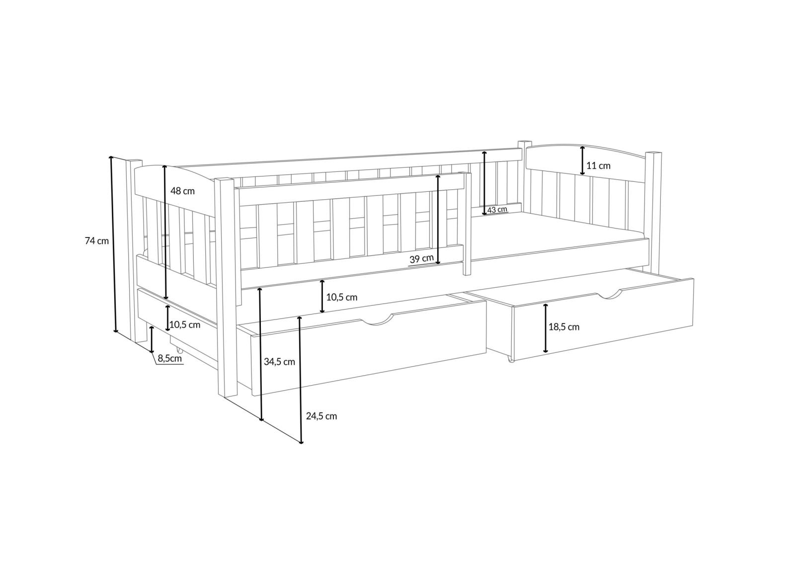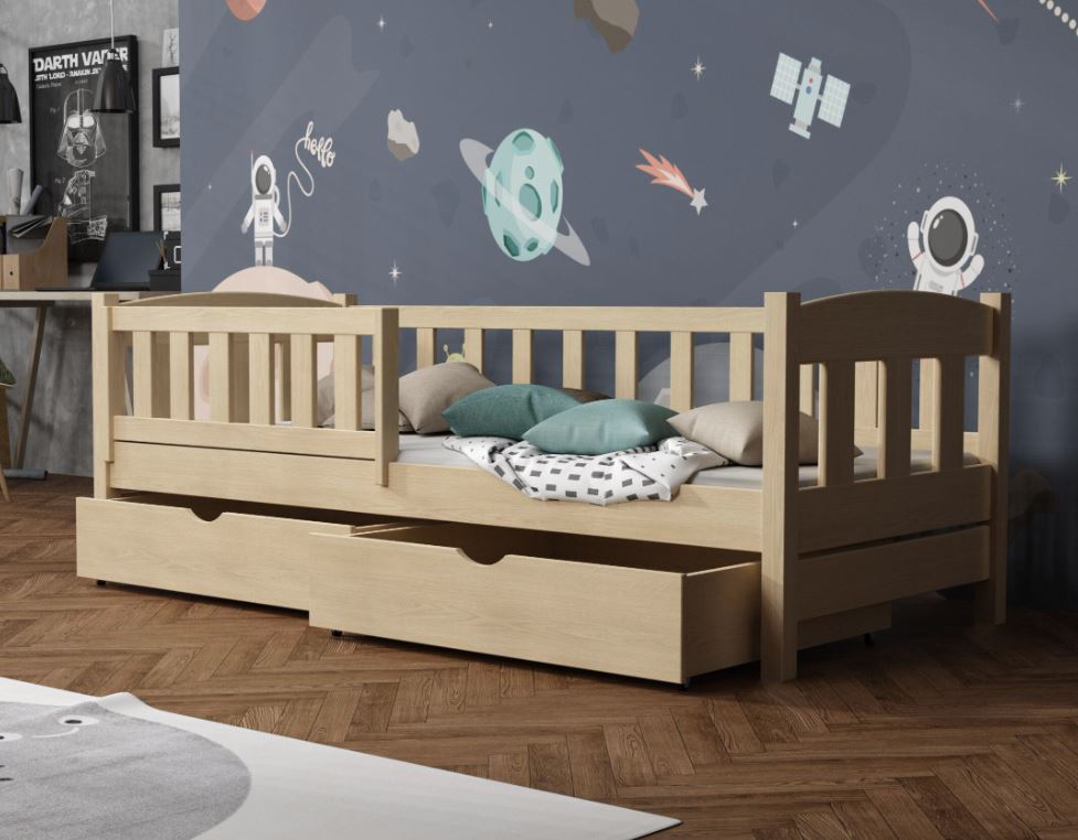 Posteľ BEN sa vďaka minimalistickému designu hodí do každého interiéru. Tento model nie je len miestom pre nočný odpočinok, ale aj pre zábavu! Jednolôžková posteľ BEN je vyrobená z masívneho borovicového dreva , vďaka čomu je mimoriadne pevná a odolná proti poškodeniu. U bočníc a čiel je šírka použitého materiálu 2,6 cm . Bezpečnostná zábrana zaistí vášmu dieťaťu bezpečný spánok po celú noc a zabráni možnosti vypadnutia. Tento prvok je možné odstrániť, keď dieťa povyrastie a už ho nepotrebuje. Posteľ ponúkame v niekoľkých farebných variantoch, prípadne bez povrchových úprav. Surové drevo ponúka prirodzený vzhľad. Posteľ je ekologická, odolná a dá sa ľahko prispôsobiť - jej vzhľad môžete upraviť morením, lakovaním alebo maľovaním podľa vlastného uváženia. Farebné varianty sú ošetrené ekologickým lakom bez zápachu, ktorý zvyšuje odolnosť postele proti poškriabaniu. Posteľ dodávame s dvoma priestrannými šuplíkmi , ktoré slúžia na ukladanie lôžkovín a pomôžu udržať poriadok v detskej izbe. Súčasťou postele je aj kvalitný rošt .