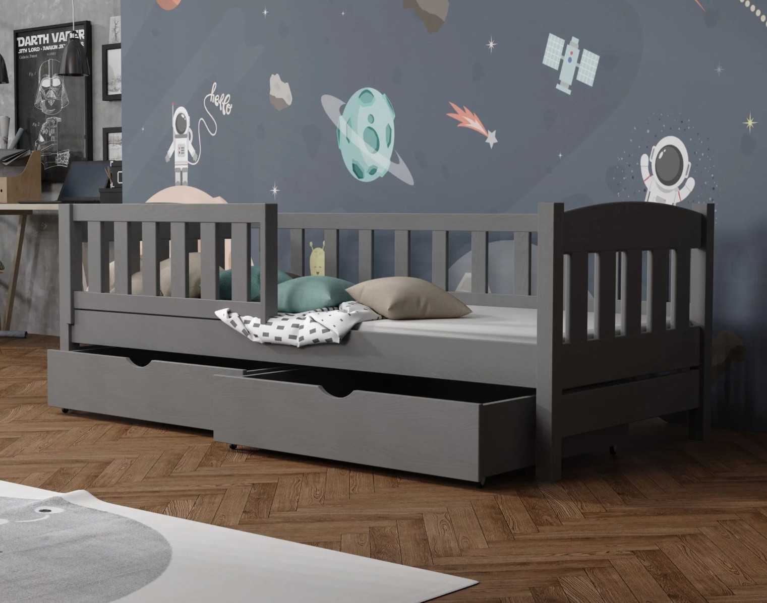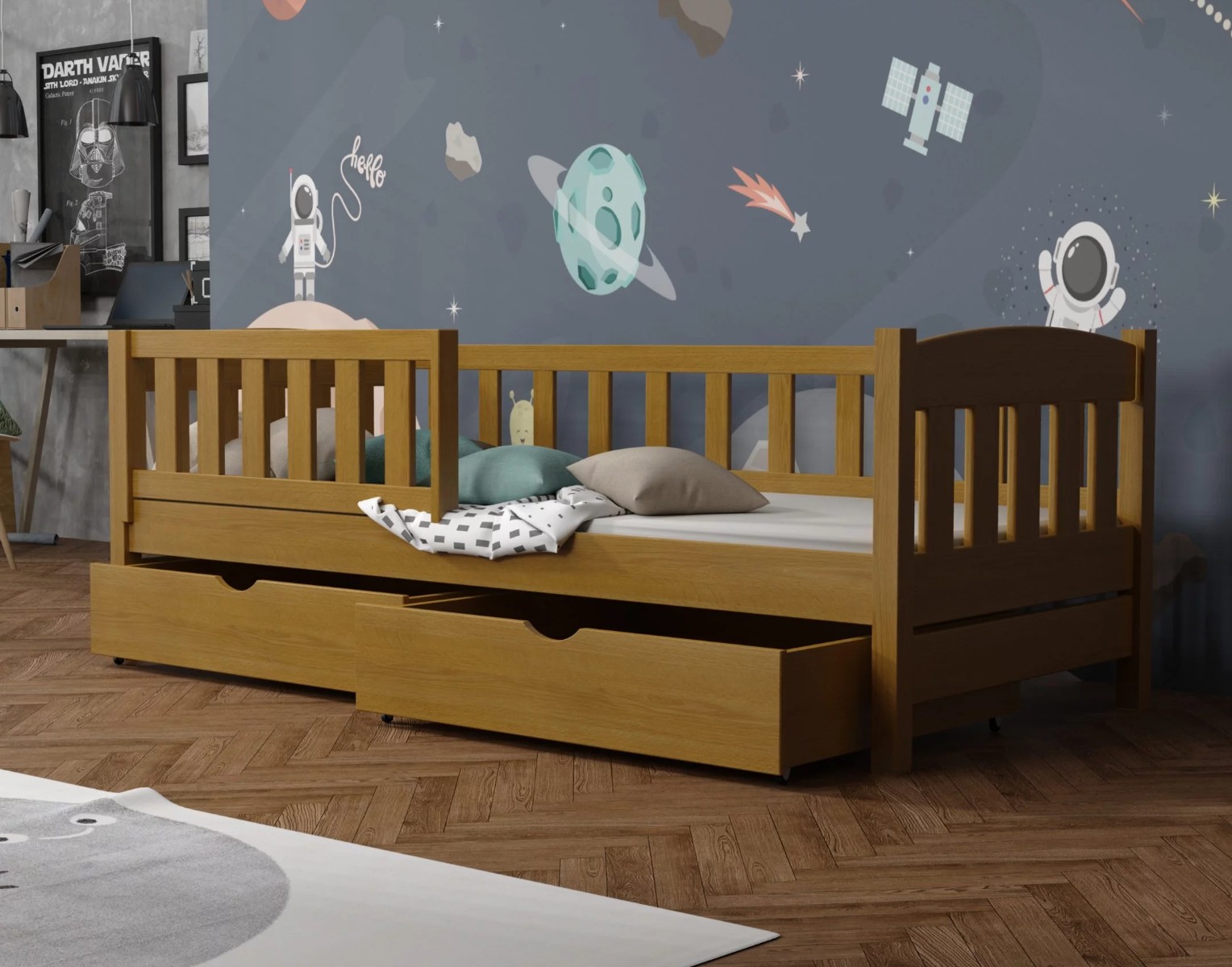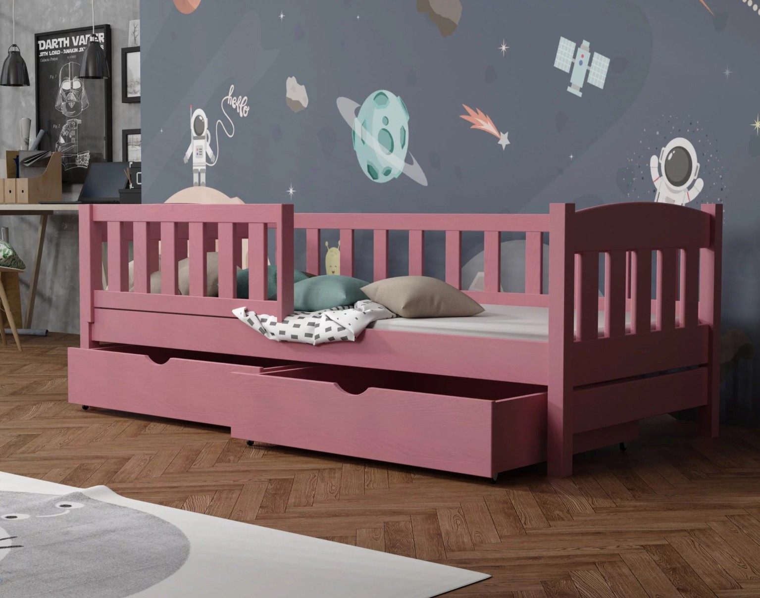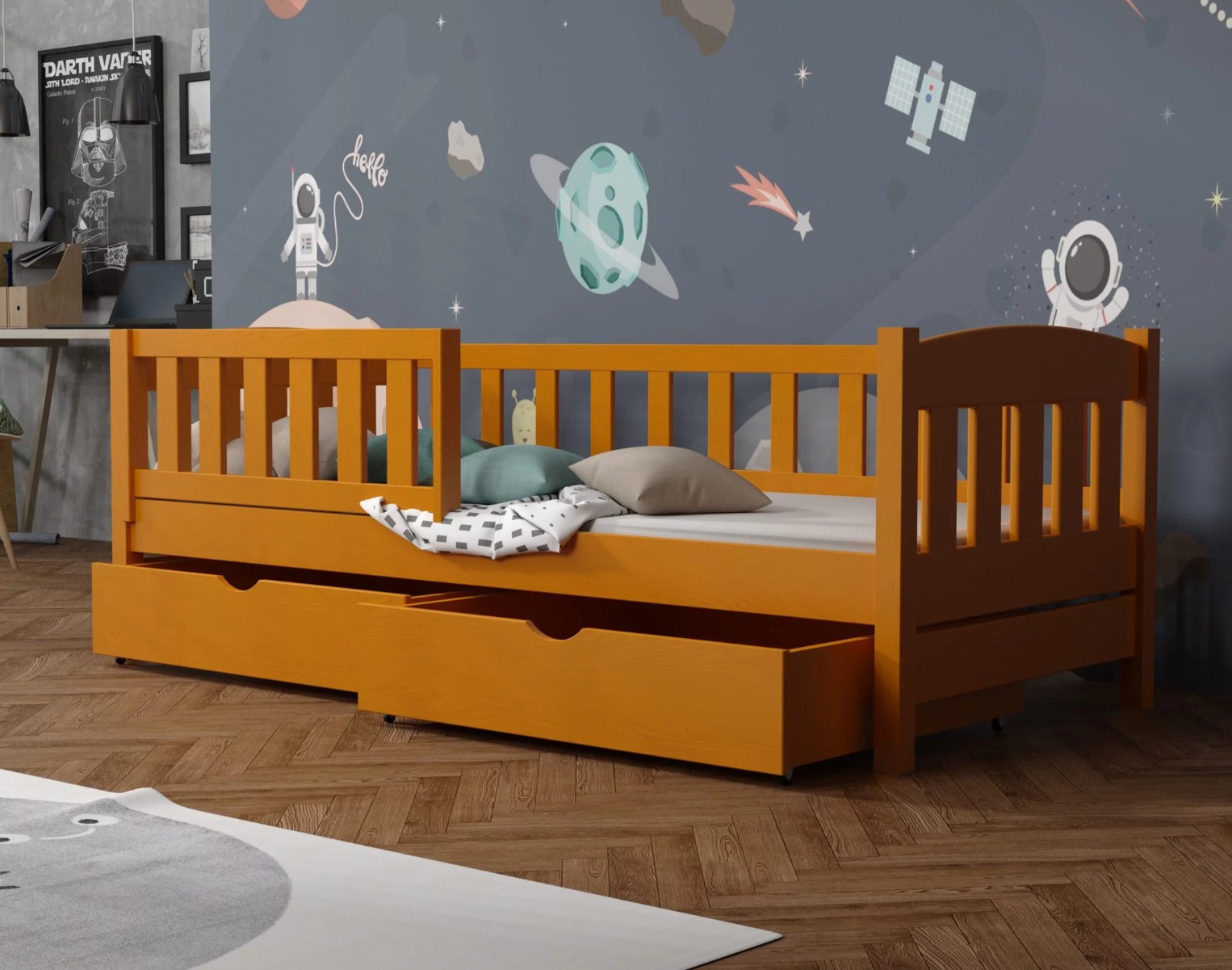 Posteľ BEN sa vďaka minimalistickému designu hodí do každého interiéru. Tento model nie je len miestom pre nočný odpočinok, ale aj pre zábavu! Jednolôžková posteľ BEN je vyrobená z masívneho borovicového dreva , vďaka čomu je mimoriadne pevná a odolná proti poškodeniu. U bočníc a čiel je šírka použitého materiálu 2,6 cm . Bezpečnostná zábrana zaistí vášmu dieťaťu bezpečný spánok po celú noc a zabráni možnosti vypadnutia. Tento prvok je možné odstrániť, keď dieťa povyrastie a už ho nepotrebuje. Posteľ ponúkame v niekoľkých farebných variantoch, prípadne bez povrchových úprav. Surové drevo ponúka prirodzený vzhľad. Posteľ je ekologická, odolná a dá sa ľahko prispôsobiť - jej vzhľad môžete upraviť morením, lakovaním alebo maľovaním podľa vlastného uváženia. Farebné varianty sú ošetrené ekologickým lakom bez zápachu, ktorý zvyšuje odolnosť postele proti poškriabaniu. Posteľ dodávame s dvoma priestrannými šuplíkmi , ktoré slúžia na ukladanie lôžkovín a pomôžu udržať poriadok v detskej izbe. Súčasťou postele je aj kvalitný rošt .