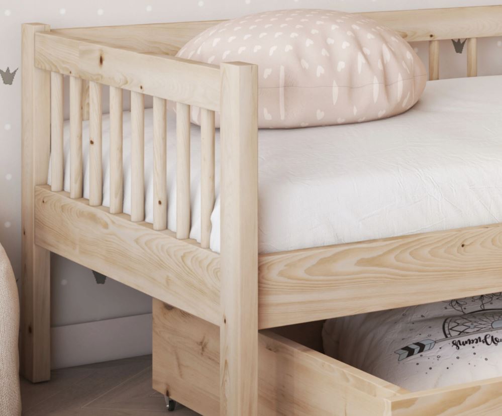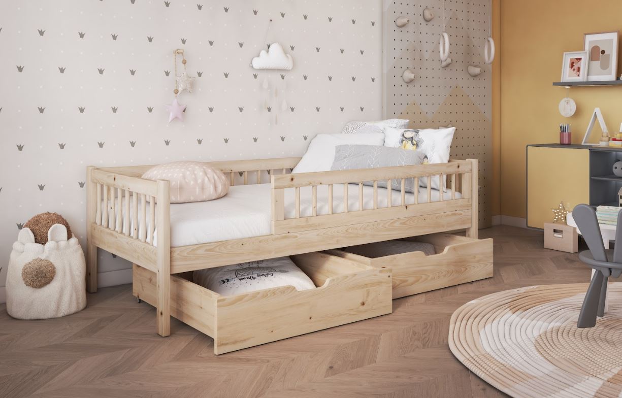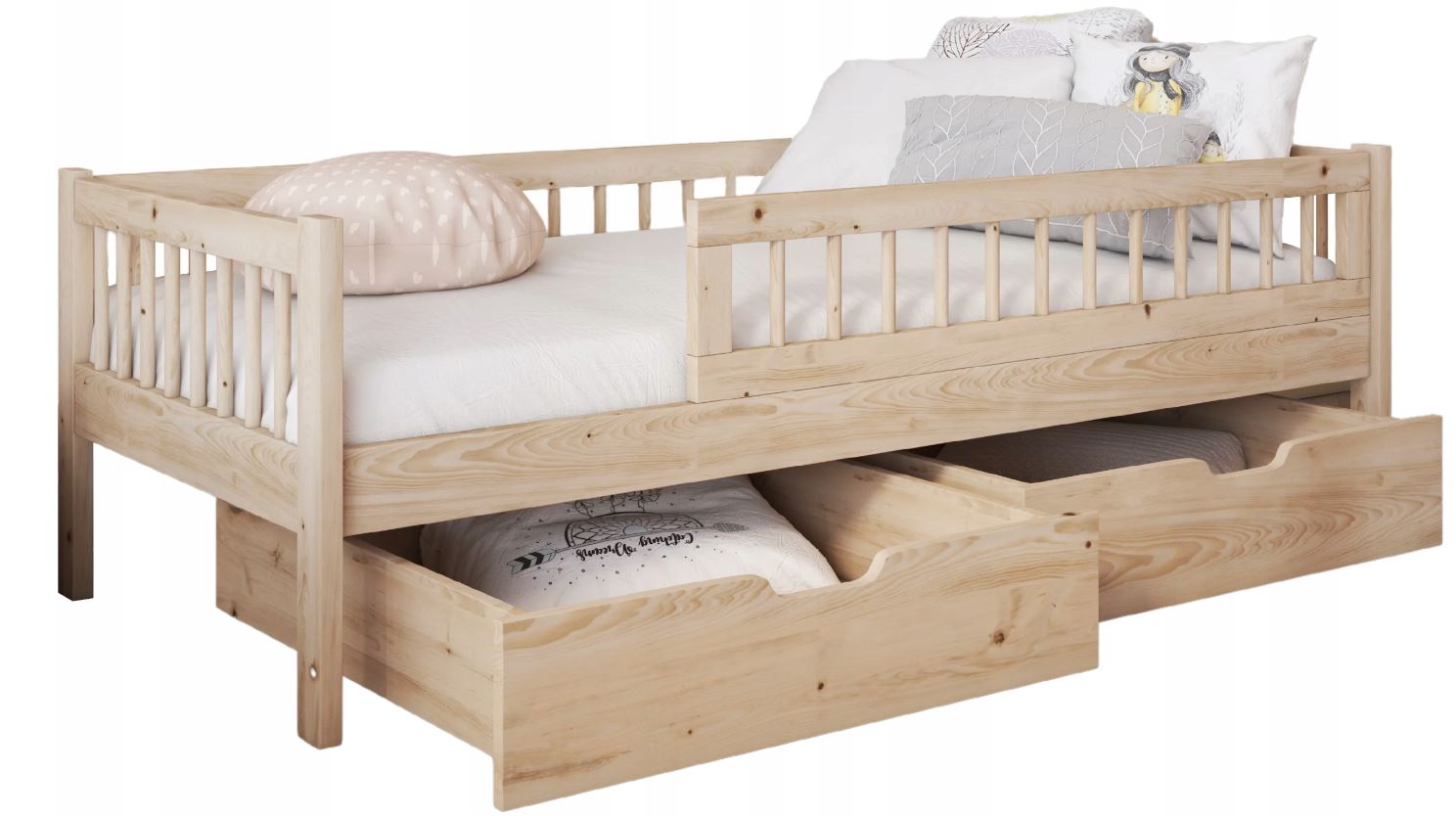 Detská posteľ z masívu borovice FLORES je elegantné jednolôžko, ktoré dokonale kombinuje funkčnosť s moderným designom. Posteľ sa vyznačuje svojou praktickosťou a atraktívnym dizajnom , ktorý skvele zapadne do každej detskej izby. Posteľ je vyrobená z veľmi kvalitného borovicového dreva , ktoré je ošetrené tromi vrstvami ekologického laku. Tým je zaistená vysoká odolnosť postele voči mechanickému poškodeniu a rôznym druhom nečistôt. Bezpečnosť detí zaisťujú vysoké bočnice a ochranná bariéra , ktorá zabráni nechceným pádom dieťaťa počas spánku. Posteľ je dodávaná s dvoma priestrannými šuplíkmi na kolieskach, kam si môžete uložiť lôžkoviny, hračky alebo iné nevyhnutnosti.