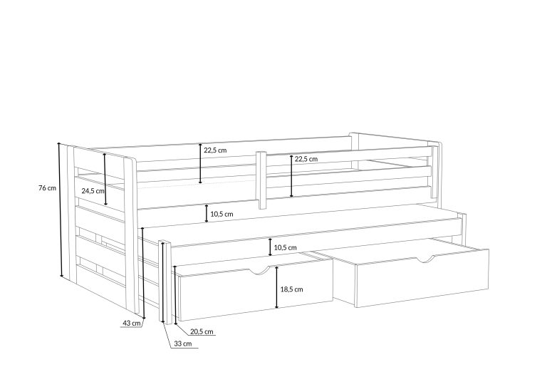 Detská posteľ s výsuvnou prístelkou JOLANA je skvelou voľbou do izby pre súrodencov, ktorá bude dokonale ladiť s dizajnom interiéru a zároveň zaistí vašim deťom zdravý a kvalitný spánok každú noc. Skvele sa bude hodiť aj do izby jedináčika, kedy prídavné výsuvné lôžko poskytne plnohodnotné miesto na prespanie pre kamaráta alebo rodiča v prípade potreby. Uzavretý design postele navyše dodáva deťom útulný pocit. Posteľ Jolana je dokonalým riešením, ktoré kombinuje funkčnosť s estetikou. Ochranné zábradlie postieľky účinne chráni dieťa pred vypadnutím a dva hlboké šuplíky umožňujú pohodlné uloženie lôžkovín, oblečenia alebo hračiek. Posteľ je vyrobená z veľmi kvalitného borovicového dreva , vďaka čomu je pevná a stabilná. U bočníc a čiel je šírka použitého materiálu 2,6 cm . Posteľ je ošetrená ekologickým lakom na vodnej báze, ktorý posteľ chráni pred poškodením a poškriabaním. Posteľ je dodávaná vrátane kvalitných roštov a ochrannej bariérky s možnosťou univerzálnej montáže na pravú aj ľavú stranu.