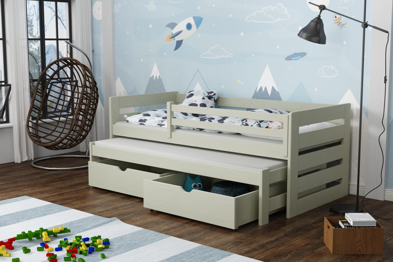 Detská posteľ z masívu borovice JOLANA s prístelkou a šuplíky - 200x90 cm - OLIVOVO ZELENÁ