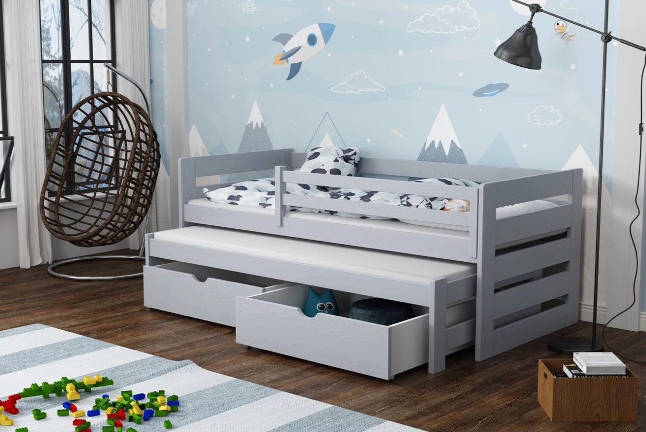 Detská posteľ z masívu borovice JOLANA s prístelkou a šuplíky - 200x90 cm - ŠEDÁ