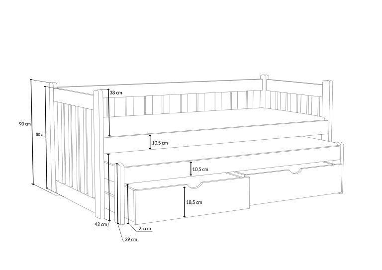 Detská posteľ s výsuvnou prístelkou bola navrhnutá tak, aby poskytla nočný odpočinok každému malému prieskumníkovi, ktorý si potrebuje oddýchnuť a zregenerovať sa po dni plnom zábavy a vzrušenia. Vďaka jednoduchému zábradliu dodáva nábytok pocit neuveriteľného pohodlia a útulnosti, vďaka ktorému bude dieťa spať celú noc a ráno bude pripravené na nové dobrodružstvá. Pohodlná výsuvná prístelka poskytne miesto na spanie pre rodičov, kamaráta alebo súrodenca, s ktorým vaše dieťa zdieľa izbu. Kryšpín je posteľ, ktorá sa okrem pevnej drevenej konštrukcie vyznačuje aj minimalistickou estetikou a vysokým bezpečnostným štandardom. Nábytok je vybavený dvoma vysokými opierkami hlavy a zábranou chrániacou dieťa pred prípadným pádom. Pri výrobe bolo použité iba najkvalitnejšie masívne borovicové drevo . U bočníc a čiel je šírka použitého materiálu 2,6 cm . Všetky drevené prvky sú pokryté lakom na vodnej báze, ktorý je ekologický a bez zápachu. Kryšpín má tiež dve hlboké zásuvky , vďaka ktorým pohodlne uložíte lôžkoviny alebo detské veci. Posteľ je dodávaná vrátane kvalitných roštov .