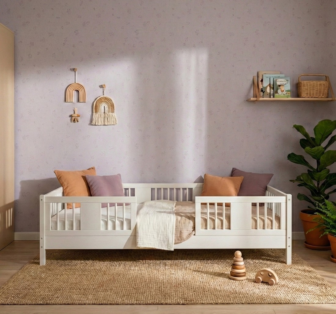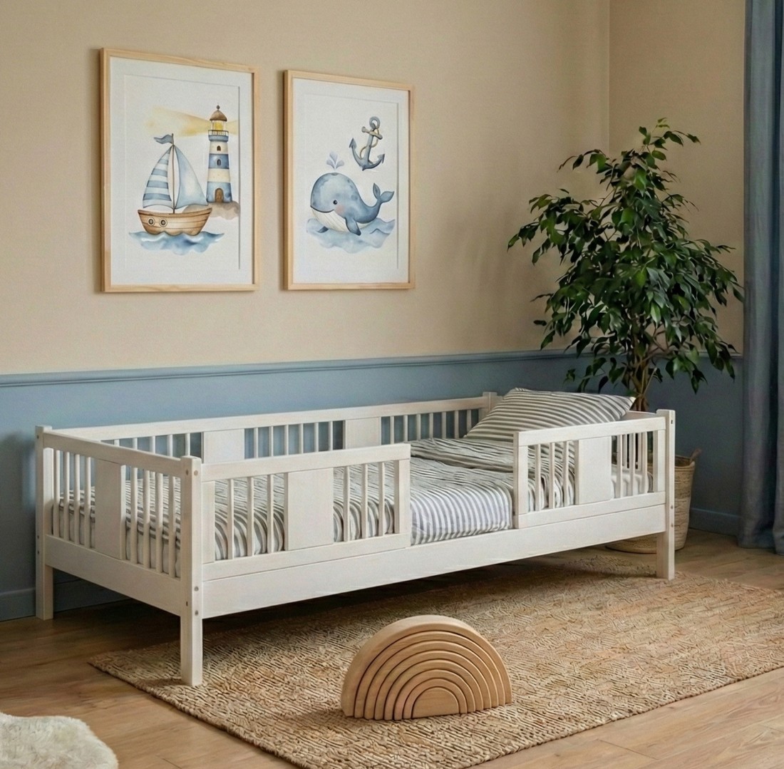 LUNA 10 cm je drevená detská posteľ s 10 cm zvýšeným roštom, ktorá kombinuje funkčnosť, estetiku a bezpečnosť. Jej decentný tvar so zaoblenými lamelami a prírodnými materiálmi z nej robí ideálnu voľbu pre škandinávsky štýl a izby inšpirované Montessori. Je to perfektná voľba pre rodičov, ktorí hľadajú prvú posteľ pre dieťa, ktorá zaistí pohodlný spánok a krásny interiér. Posteľ LUNA 10 je vyrobená výhradne z prírodného borovicového dreva o sile 2,2 cm, známeho pre svoju odolnosť a hrejivý, príjemný vzhľad. Všetky prvky sú hladko brúsené a zaoblené, čo zaisťuje úplnú bezpečnosť aj pre najmenšie deti. Povrchová úprava je prevedená ekologickými farbami na vodnej báze, ktoré spĺňajú európsku normu EN 71-3 – bez zápachu, toxínov a škodlivých látok. Vďaka tomu je posteľ LUNA 10 ideálna do izieb alergikov alebo dojčiat. Posteľ ponúkame aj vo verzii bez povrchových úprav - nelakované drevo. Vďaka tomu sa dá ľahko prispôsobiť - jej vzhľad môžete upraviť morením, lakovaním alebo maľovaním podľa vlastného uváženia. Každý prvok rámu bol precízne vyleštený a hrany sú jemne zaoblené, aby bolo zaistené maximálne pohodlie a bezpečnosť. Bezpečnostné zábrany pri vstupe do postele sú odnímateľné.