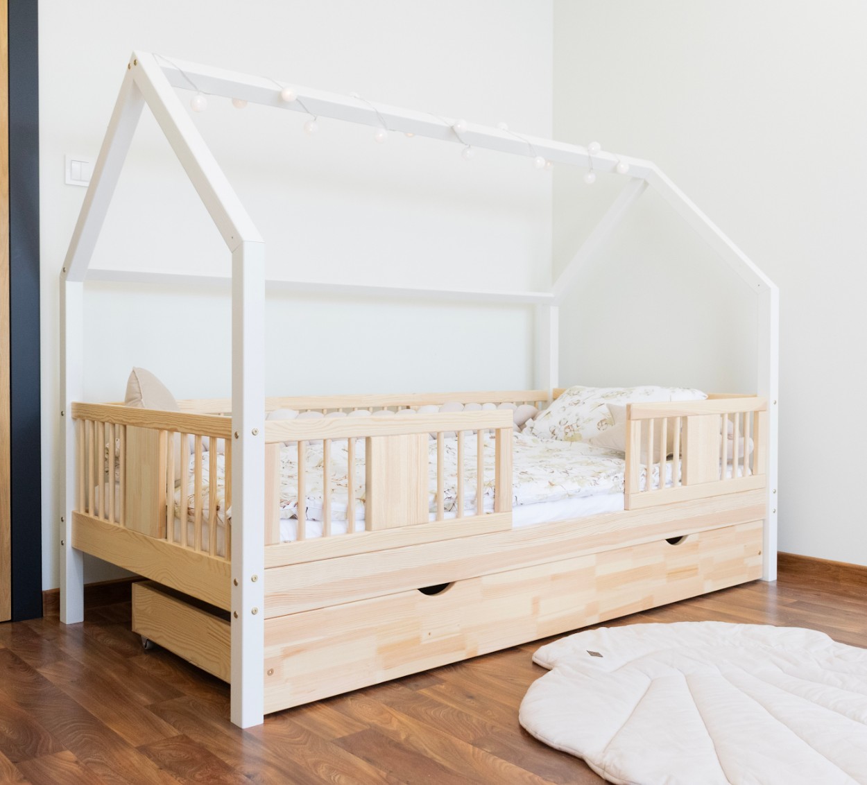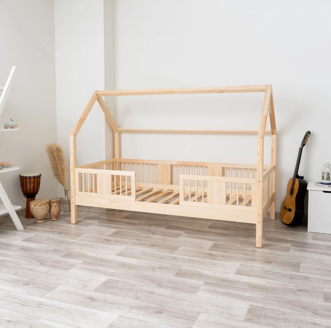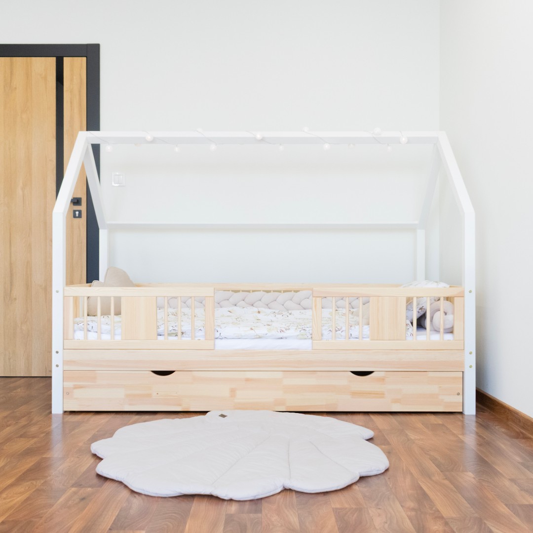 Posteľ LUNA 20 je harmonickou kombináciou prírodného borovicového dreva, bezpečnej konštrukcie a jemného dizajnu vhodného pre deti. Verzia s nohami s výškou 20 cm prináša do detskej izby novú úroveň funkčnosti – pod rámom postele je možné umiestniť voliteľnú zásuvku na posteľnú bielizeň, hračky alebo doplnky dennej potreby. Toto riešenie umožňuje maximálne využitie priestoru bez obetovania estetiky a pohodlia. Čelá postele sú zdobené okrúhlymi, sústruženými lamelami, ktoré jej dodávajú decentný a útulný vzhľad inšpirovaný škandinávskym štýlom. Tieto detaily dodávajú posteli LUNA 20 ľahký a moderný vzhľad a zároveň si zachovávajú teplý, útulný pocit, ideálny do detskej izby. Každý prvok postele LUNA 20 cm je vyrobený z lepeného borovicového dreva, ktoré je cenené pre svoju odolnosť, stabilitu a prírodný vzhľad. Drevo je starostlivo brúsené a hrany sú jemne zaoblené, takže je úplne bezpečné pre najmladších užívateľov. Na povrchovú úpravu boli použité ekologické farby na vodnej báze, ktoré spĺňajú bezpečnostné normy. Posteľ ponúkame aj vo verzii bez povrchových úprav - nelakované drevo. Vďaka tomu sa dá ľahko prispôsobiť - jej vzhľad môžete upraviť morením, lakovaním alebo maľovaním podľa vlastného uváženia. Každý prvok rámu bol precízne vyleštený a hrany sú jemne zaoblené, aby bolo zaistené maximálne pohodlie a bezpečnosť. Bezpečnostné zábrany pri vstupe do postele sú odnímateľné.