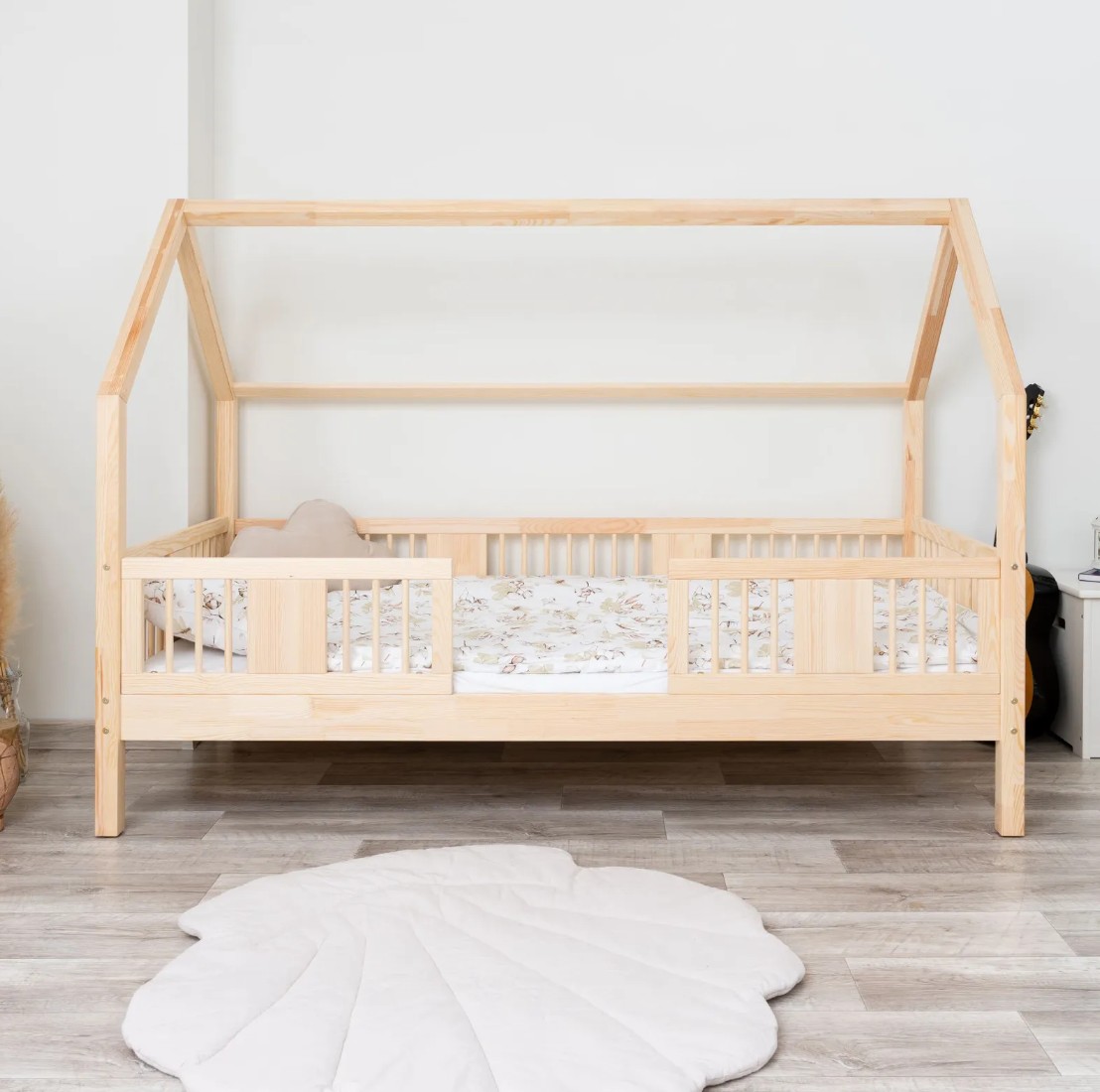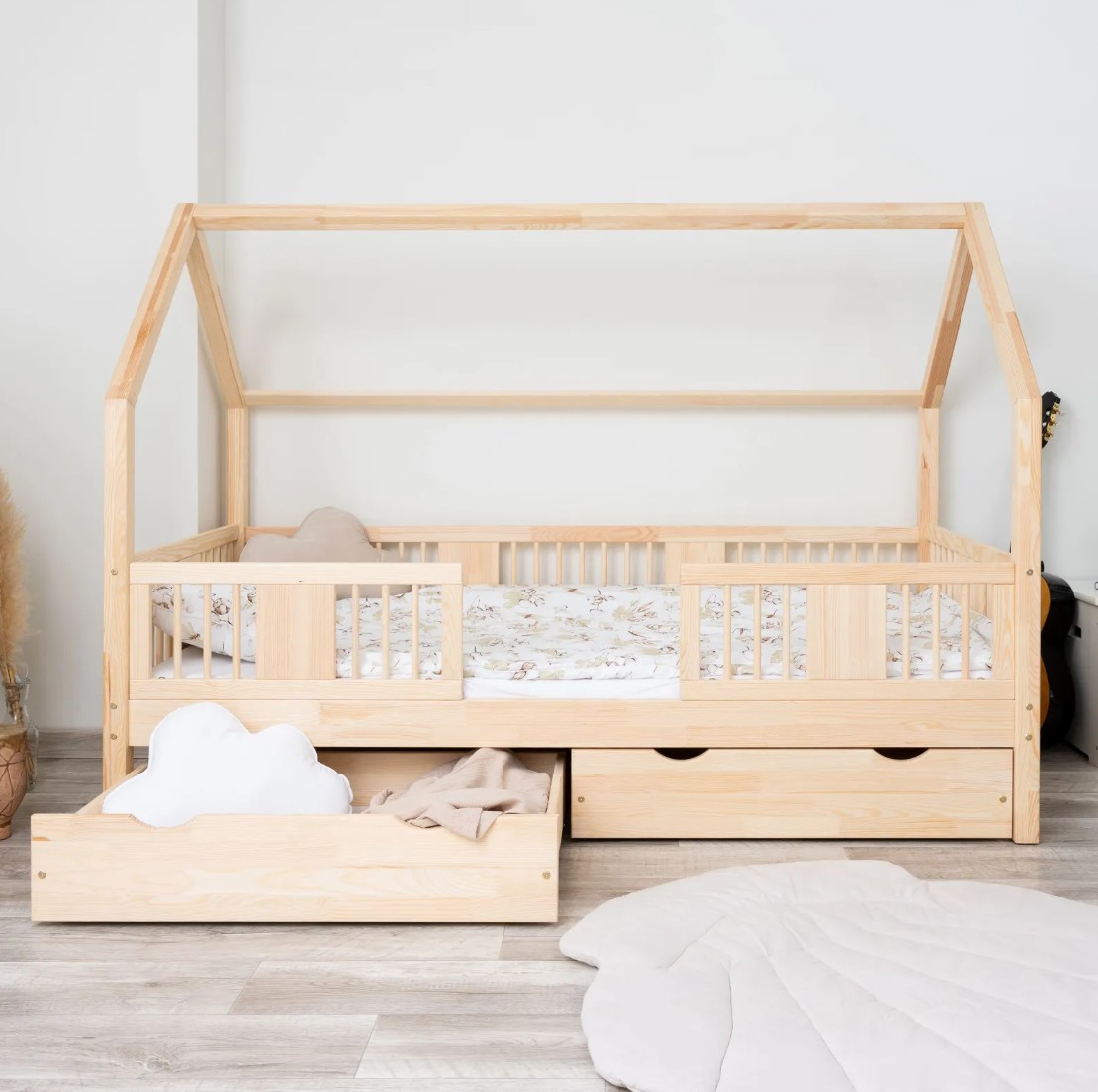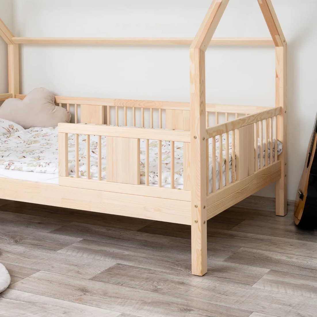 Posteľ LUNA 20 je harmonickou kombináciou prírodného borovicového dreva, bezpečnej konštrukcie a jemného dizajnu vhodného pre deti. Verzia s nohami s výškou 20 cm prináša do detskej izby novú úroveň funkčnosti – pod rámom postele je možné umiestniť voliteľnú zásuvku na posteľnú bielizeň, hračky alebo doplnky dennej potreby. Toto riešenie umožňuje maximálne využitie priestoru bez obetovania estetiky a pohodlia. Čelá postele sú zdobené okrúhlymi, sústruženými lamelami, ktoré jej dodávajú decentný a útulný vzhľad inšpirovaný škandinávskym štýlom. Tieto detaily dodávajú posteli LUNA 20 ľahký a moderný vzhľad a zároveň si zachovávajú teplý, útulný pocit, ideálny do detskej izby. Každý prvok postele LUNA 20 cm je vyrobený z lepeného borovicového dreva, ktoré je cenené pre svoju odolnosť, stabilitu a prírodný vzhľad. Drevo je starostlivo brúsené a hrany sú jemne zaoblené, takže je úplne bezpečné pre najmladších užívateľov. Na povrchovú úpravu boli použité ekologické farby na vodnej báze, ktoré spĺňajú bezpečnostné normy. Posteľ ponúkame aj vo verzii bez povrchových úprav - nelakované drevo. Vďaka tomu sa dá ľahko prispôsobiť - jej vzhľad môžete upraviť morením, lakovaním alebo maľovaním podľa vlastného uváženia. Každý prvok rámu bol precízne vyleštený a hrany sú jemne zaoblené, aby bolo zaistené maximálne pohodlie a bezpečnosť. Bezpečnostné zábrany pri vstupe do postele sú odnímateľné.