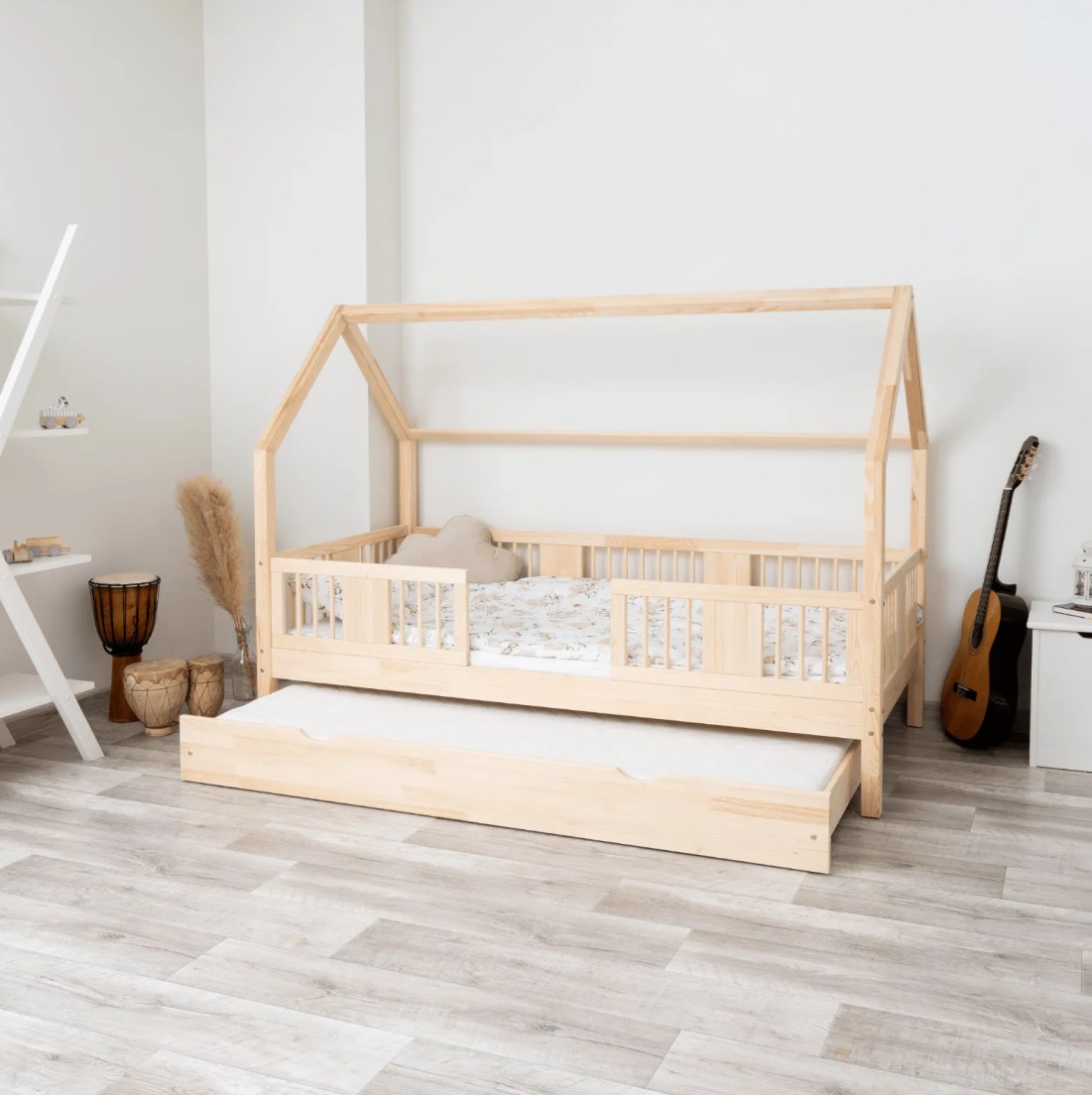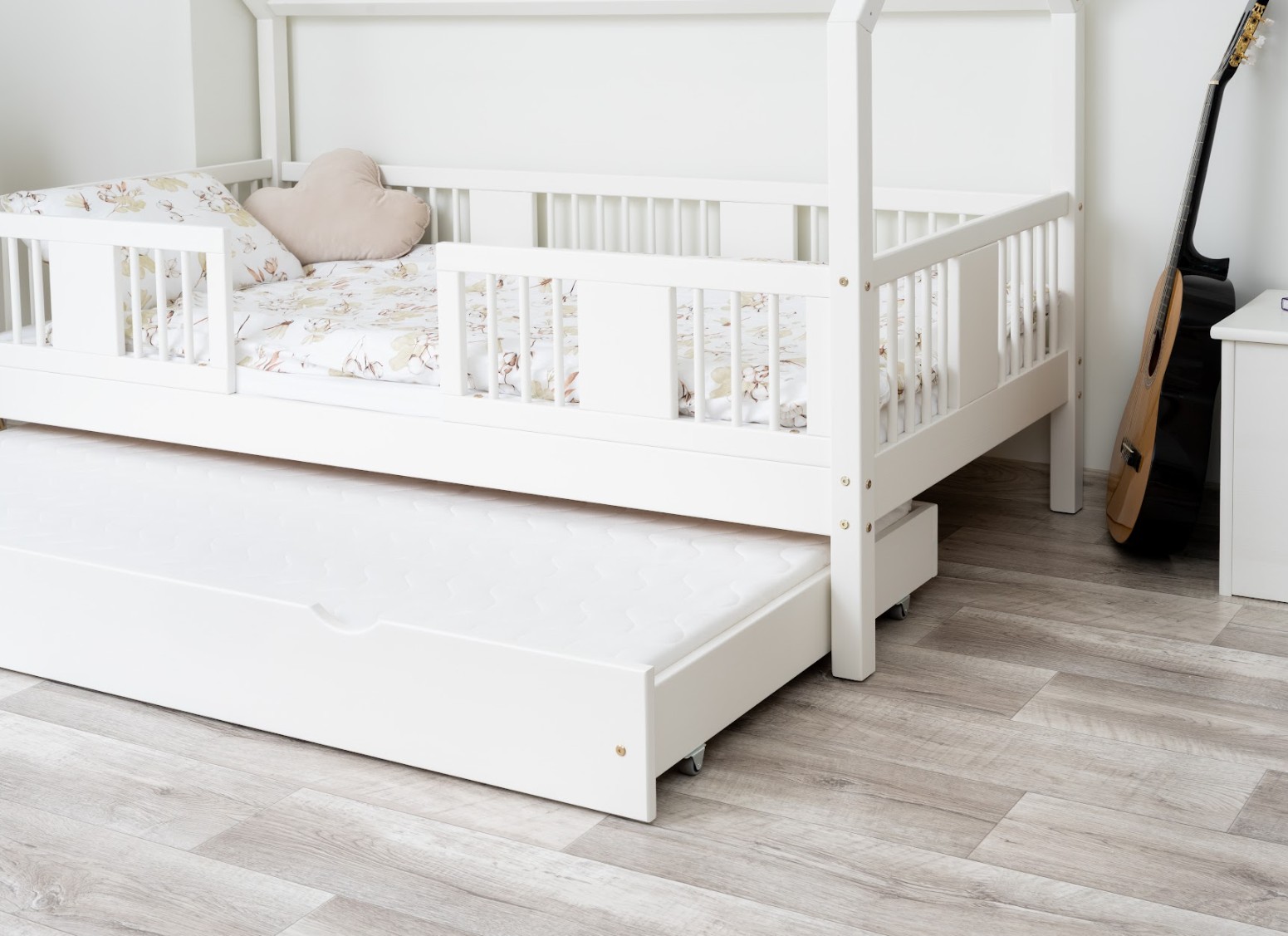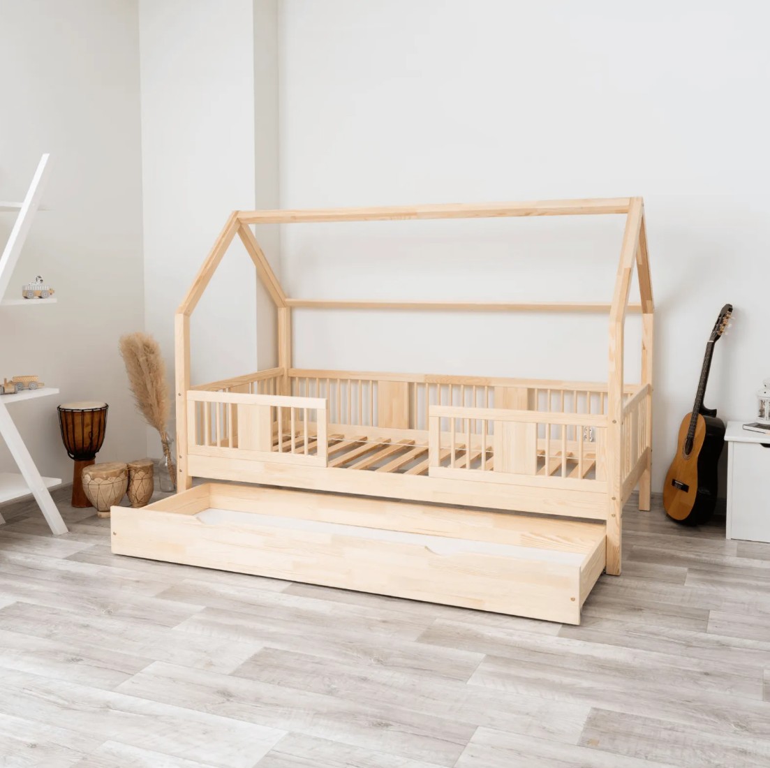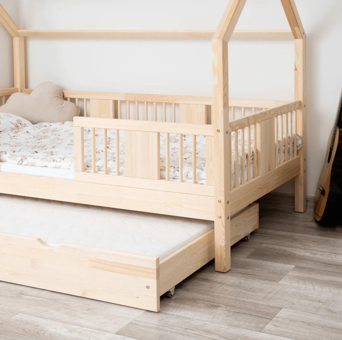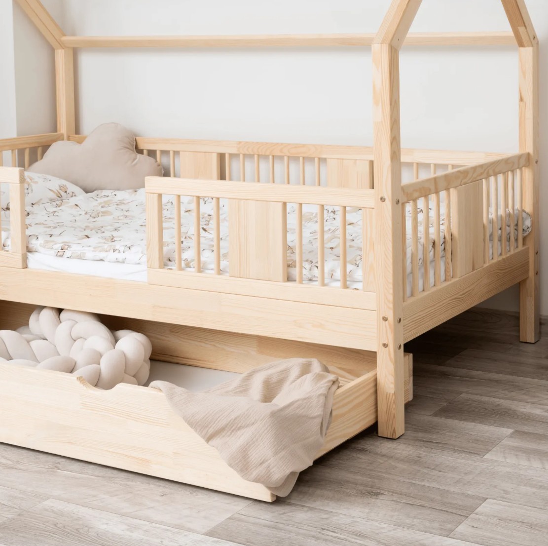 Táto detská posteľ je vytvorená tak, aby ušetrila priestor v detskej izbe. K posteli je možné tiež dokúpiť praktický a priestranný šuplík z masívu v niekoľkých variantoch: