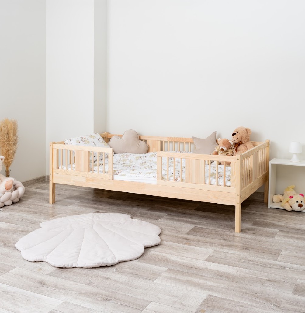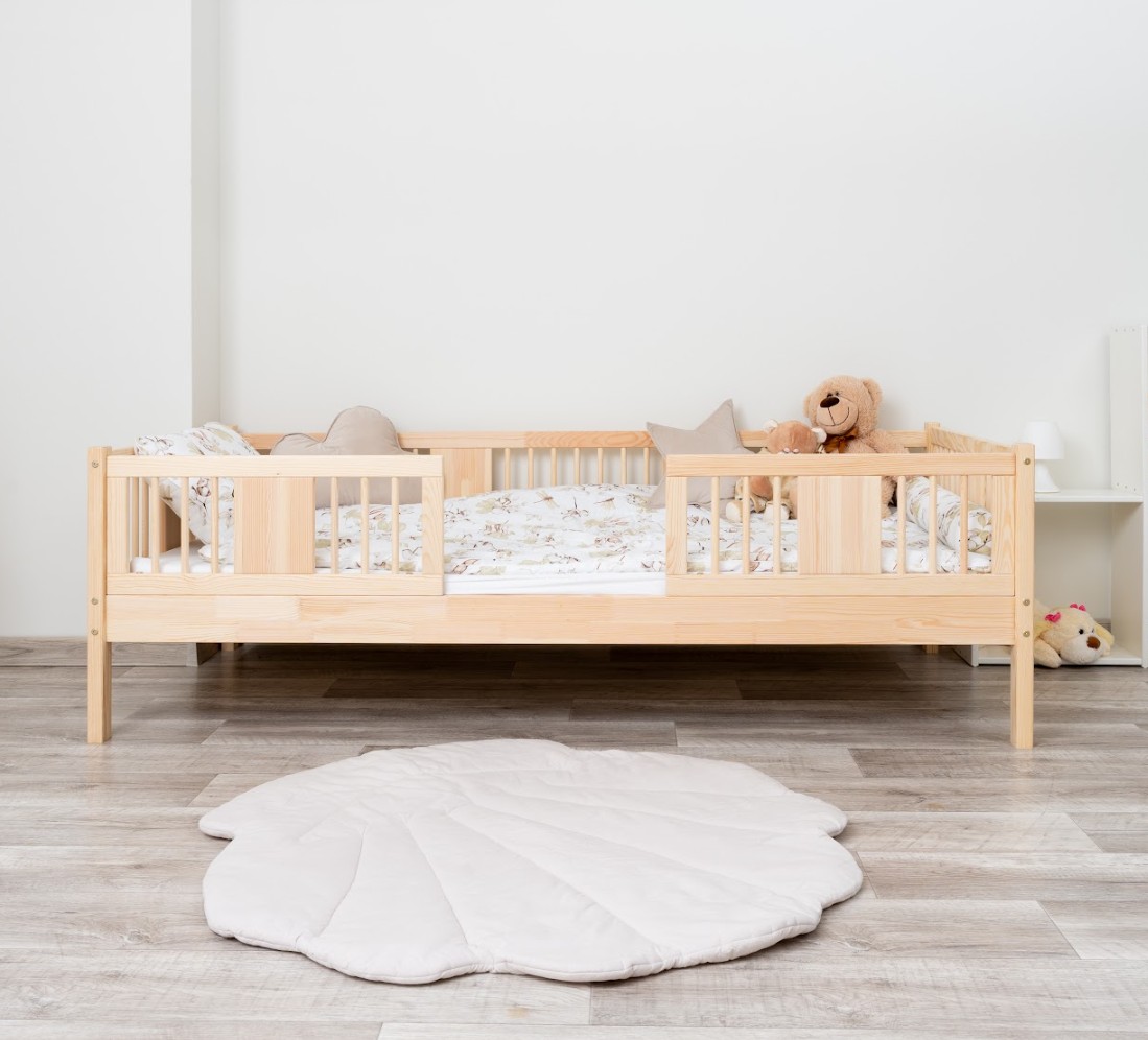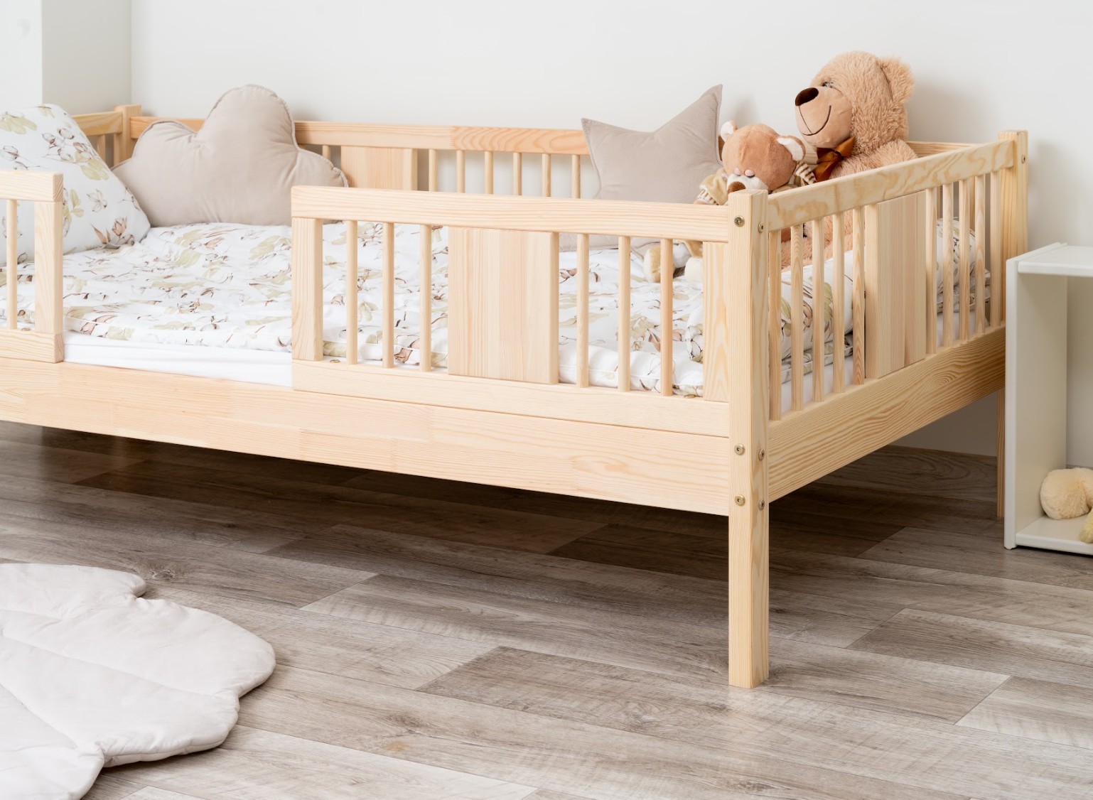 Posteľ LUNA 20 je harmonickou kombináciou prírodného borovicového dreva, bezpečnej konštrukcie a jemného dizajnu vhodného pre deti. Verzia s nohami s výškou 20 cm prináša do detskej izby novú úroveň funkčnosti – pod rámom postele je možné umiestniť voliteľnú zásuvku na posteľnú bielizeň, hračky alebo doplnky dennej potreby. Toto riešenie umožňuje maximálne využitie priestoru bez obetovania estetiky a pohodlia. Čelá postele sú zdobené okrúhlymi, sústruženými lamelami, ktoré jej dodávajú decentný a útulný vzhľad inšpirovaný škandinávskym štýlom. Tieto detaily dodávajú posteli LUNA 20 ľahký a moderný vzhľad a zároveň si zachovávajú teplý, útulný pocit, ideálny do detskej izby. Každý prvok postele LUNA 20 cm je vyrobený z lepeného borovicového dreva, ktoré je cenené pre svoju odolnosť, stabilitu a prírodný vzhľad. Drevo je starostlivo brúsené a hrany sú jemne zaoblené, takže je úplne bezpečné pre najmladších užívateľov. Na povrchovú úpravu boli použité ekologické farby na vodnej báze, ktoré spĺňajú bezpečnostné normy. Posteľ ponúkame aj vo verzii bez povrchových úprav - nelakované drevo. Vďaka tomu sa dá ľahko prispôsobiť - jej vzhľad môžete upraviť morením, lakovaním alebo maľovaním podľa vlastného uváženia. Každý prvok rámu bol precízne vyleštený a hrany sú jemne zaoblené, aby bolo zaistené maximálne pohodlie a bezpečnosť. Bezpečnostné zábrany pri vstupe do postele sú odnímateľné.