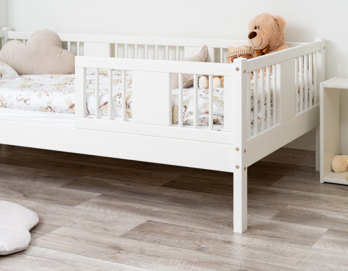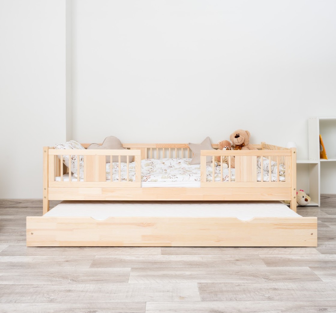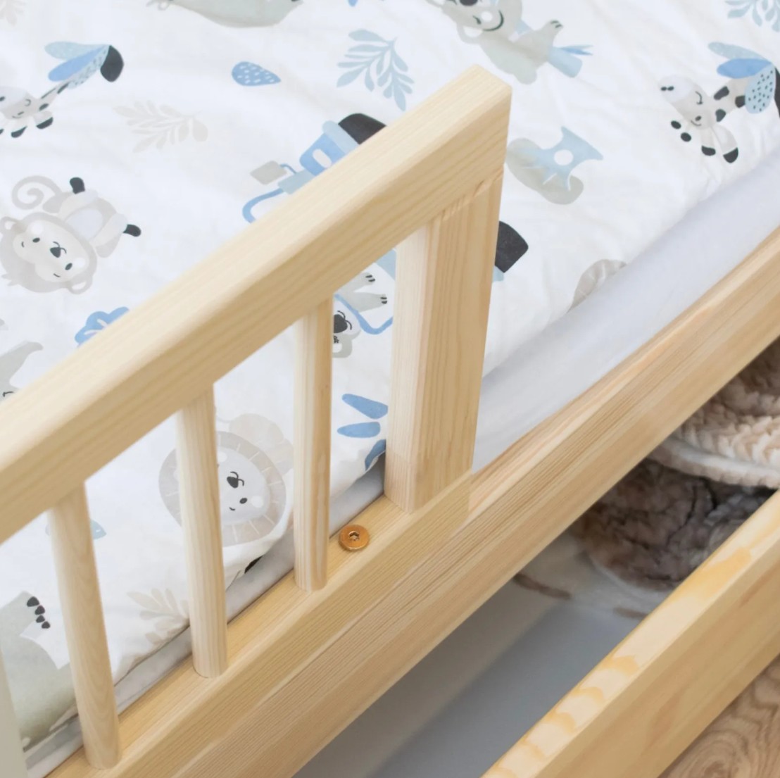 Posteľ LUNA 20 je harmonickou kombináciou prírodného borovicového dreva, bezpečnej konštrukcie a jemného dizajnu vhodného pre deti. Verzia s nohami s výškou 20 cm prináša do detskej izby novú úroveň funkčnosti – pod rámom postele je možné umiestniť voliteľnú zásuvku na posteľnú bielizeň, hračky alebo doplnky dennej potreby. Toto riešenie umožňuje maximálne využitie priestoru bez obetovania estetiky a pohodlia. Čelá postele sú zdobené okrúhlymi, sústruženými lamelami, ktoré jej dodávajú decentný a útulný vzhľad inšpirovaný škandinávskym štýlom. Tieto detaily dodávajú posteli LUNA 20 ľahký a moderný vzhľad a zároveň si zachovávajú teplý, útulný pocit, ideálny do detskej izby. Každý prvok postele LUNA 20 cm je vyrobený z lepeného borovicového dreva, ktoré je cenené pre svoju odolnosť, stabilitu a prírodný vzhľad. Drevo je starostlivo brúsené a hrany sú jemne zaoblené, takže je úplne bezpečné pre najmladších užívateľov. Na povrchovú úpravu boli použité ekologické farby na vodnej báze, ktoré spĺňajú bezpečnostné normy. Posteľ ponúkame aj vo verzii bez povrchových úprav - nelakované drevo. Vďaka tomu sa dá ľahko prispôsobiť - jej vzhľad môžete upraviť morením, lakovaním alebo maľovaním podľa vlastného uváženia. Každý prvok rámu bol precízne vyleštený a hrany sú jemne zaoblené, aby bolo zaistené maximálne pohodlie a bezpečnosť. Bezpečnostné zábrany pri vstupe do postele sú odnímateľné.