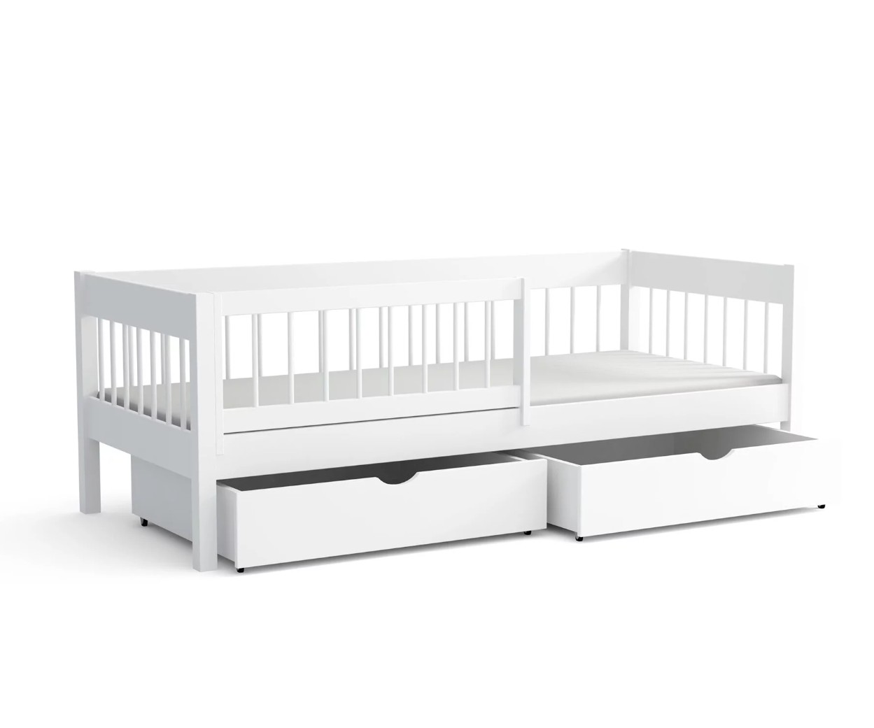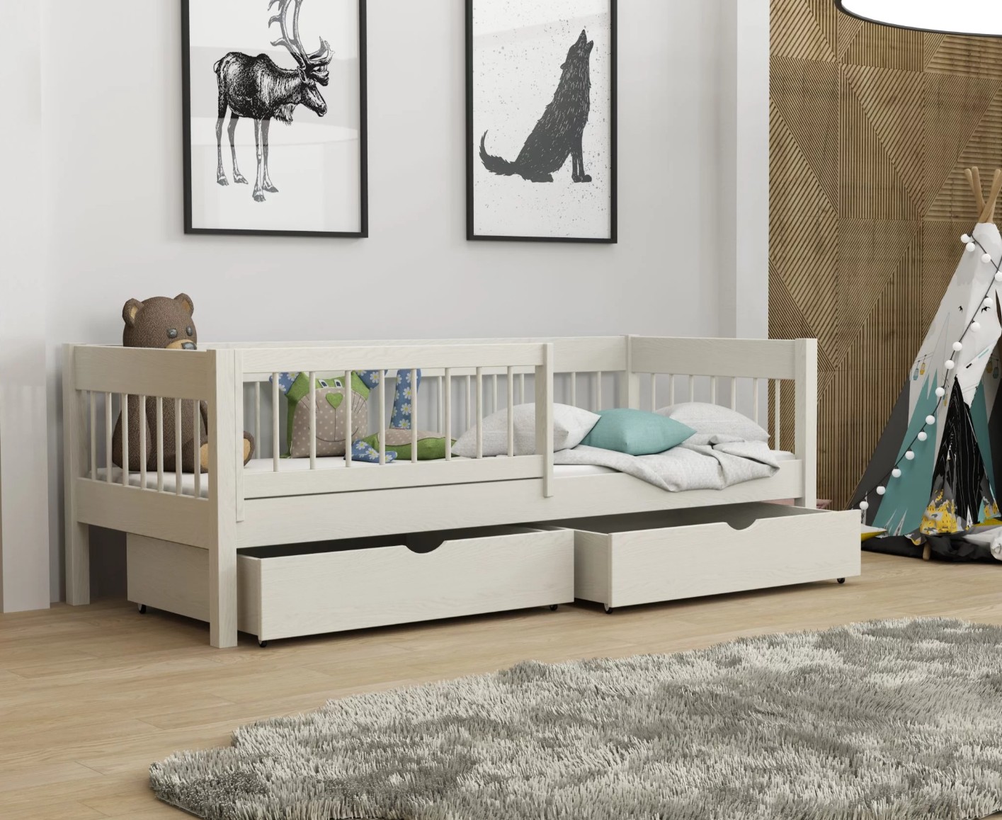 Model LUNARI je modernou interpretáciou klasickej detskej postele – nízka, stabilná a vybavená priestrannými zásuvkami , ideálnymi na uloženie posteľnej bielizne, hračiek alebo sezónneho oblečenia. Je to perfektné riešenie pre rodičov, ktorí si cenia poriadok, funkčnosť a pohodlie bez toho, aby obetovali esteticky príjemný minimalistický dizajn. Jednolôžko Lunari v sebe spája nadčasový štýl, solídne remeselné spracovanie a každodenné pohodlie. Jej konštrukcia z prírodného borovicového dreva zaručuje trvanlivosť a odolnosť voči každodennému používaniu a zároveň si zachováva ľahký a elegantný vzhľad vďaka okrúhlym priečkam tvoriacim bočné zábrany a ochrannú bariérku. U bočníc a čiel je šírka použitého materiálu 2,6 cm . Vďaka svojmu univerzálnemu dizajnu sa Lunari bez problémov hodí do rôznych štýlov interiérov – od moderného a škandinávskeho až po klasický dizajn. Táto posteľ sa bude dobre hodiť ako do izby pre batoľatá, tak do izby pre staršie deti a ponúkne vám pohodlie po mnoho rokov. Posteľ LUNARI je navrhnutá tak, aby vášmu dieťaťu poskytla maximálne pohodlie pri spaní a pocit bezpečia. Nízka bočnica chráni pred vypadnutím, čo je obzvlášť dôležité pre menšie deti. Posteľ je povrchovo upravená ekologickými lakmi na vodnej báze , ktoré sú hypoalergénne a úplne bezpečné pre kontakt s detskou pokožkou. Lunari sa perfektne hodí do akéhokoľvek priestoru – či už je to veľká izba pre súrodencov alebo malý priestor, kde sa počíta každý centimeter. Posteľ je dodávaná vrátane kvalitného roštu a odnímateľnej ochrannej bariérky s možnosťou univerzálnej montáže na pravú aj ľavú stranu.