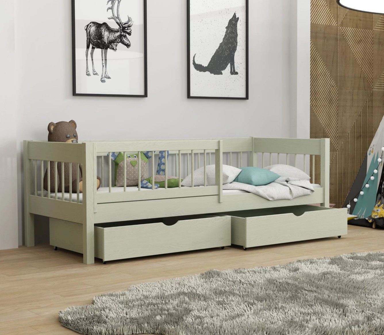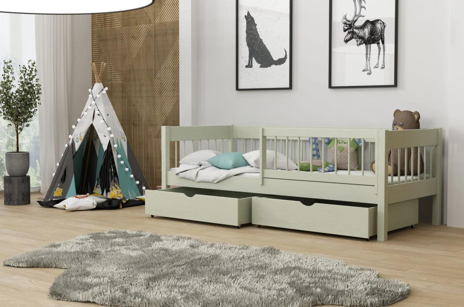 Detská posteľ z masívu borovice LUNARI so šuplíkmi - 200x90 cm - OLIVOVO ZELENÁ