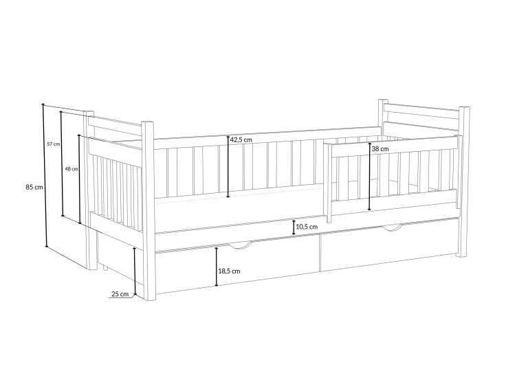Natálie je klasická jednolôžková posteľ, ktorá sa bude dobre vynímať v každej detskej izbičke. Konštrukcia z borovicového dreva je pevná a odolná a minimalistický vzhľad zapadne takmer do každého interiéru. Jednoduchá konštrukcia ide ruka v ruke s veľmi vysokou odolnosťou a nosnosťou, vďaka čomu postieľka bez problémov odolá aj detským hrám. U bočníc a čiel je šírka použitého materiálu 2,6 cm . Posteľ je pokrytá lakom na vodnej báze, ktorý nenesie riziko zdravotných problémov. Bezpečnosť detí počas spánku zaisťuje ochranná bariérka s univerzálnou možnosťou montáže na pravú aj ľavú stranu postele. Súčasťou postele sú dva priestranné šuplíky , ktoré slúžia na uloženie lôžkovín a hračiek a pevný latkový rošt .