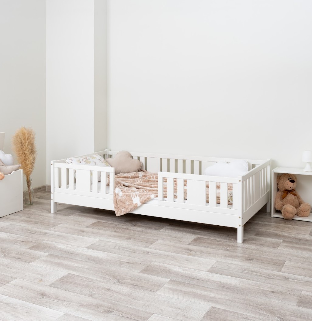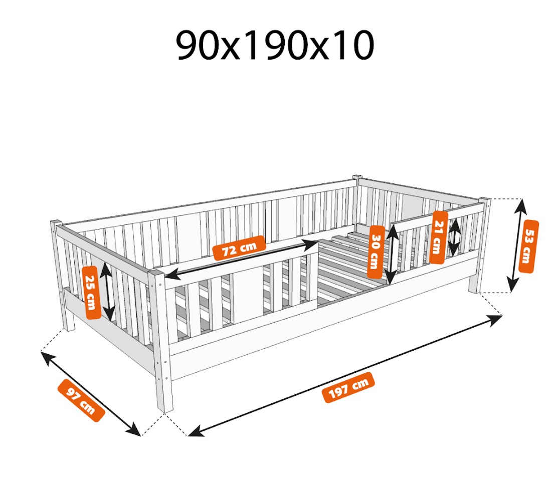 NIKO 10 cm je drevená detská posteľ s vyvýšenou konštrukciou, navrhnutá s ohľadom na pohodlie a praktickosť. Vďaka 10 cm vysokým nohám si posteľ zachováva nízky profil a zároveň umožňuje ľahké čistenie pod ňou. Je to ideálna voľba pre rodičov, ktorí hľadajú bezpečnú, funkčnú a odolnú borovicovú posteľ pre svoje dieťa. Posteľ NIKO 10 je vyrobená výhradne z prírodného borovicového dreva, známeho pre svoju odolnosť a hrejivý, príjemný vzhľad. Všetky prvky sú hladko brúsené a zaoblené, čo zaisťuje úplnú bezpečnosť aj pre najmenšie deti. Povrchová úprava je prevedená ekologickými farbami na vodnej báze, ktoré spĺňajú európsku normu EN 71-3 – bez zápachu, toxínov a škodlivých látok. Vďaka tomu je posteľ NIKO 10 ideálna do izieb alergikov alebo dojčiat. Posteľ ponúkame aj vo verzii bez povrchových úprav - nelakované drevo. Vďaka tomu sa dá ľahko prispôsobiť - jej vzhľad môžete upraviť morením, lakovaním alebo maľovaním podľa vlastného uváženia. Každý prvok rámu bol precízne vyleštený a hrany sú jemne zaoblené, aby bolo zaistené maximálne pohodlie a bezpečnosť. Bezpečnostné zábrany pri vstupe do postele sú odnímateľné.