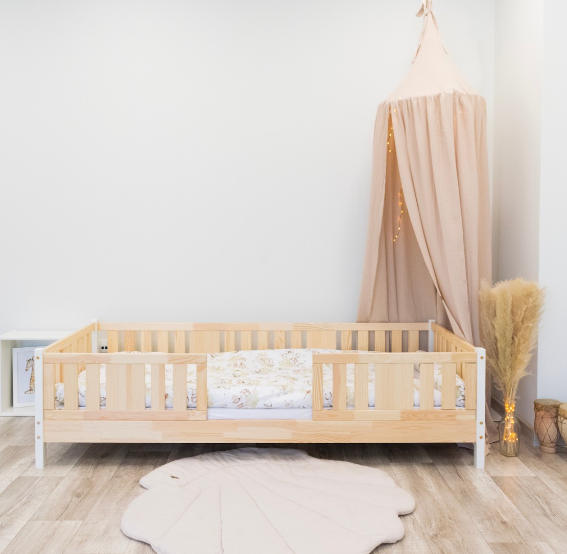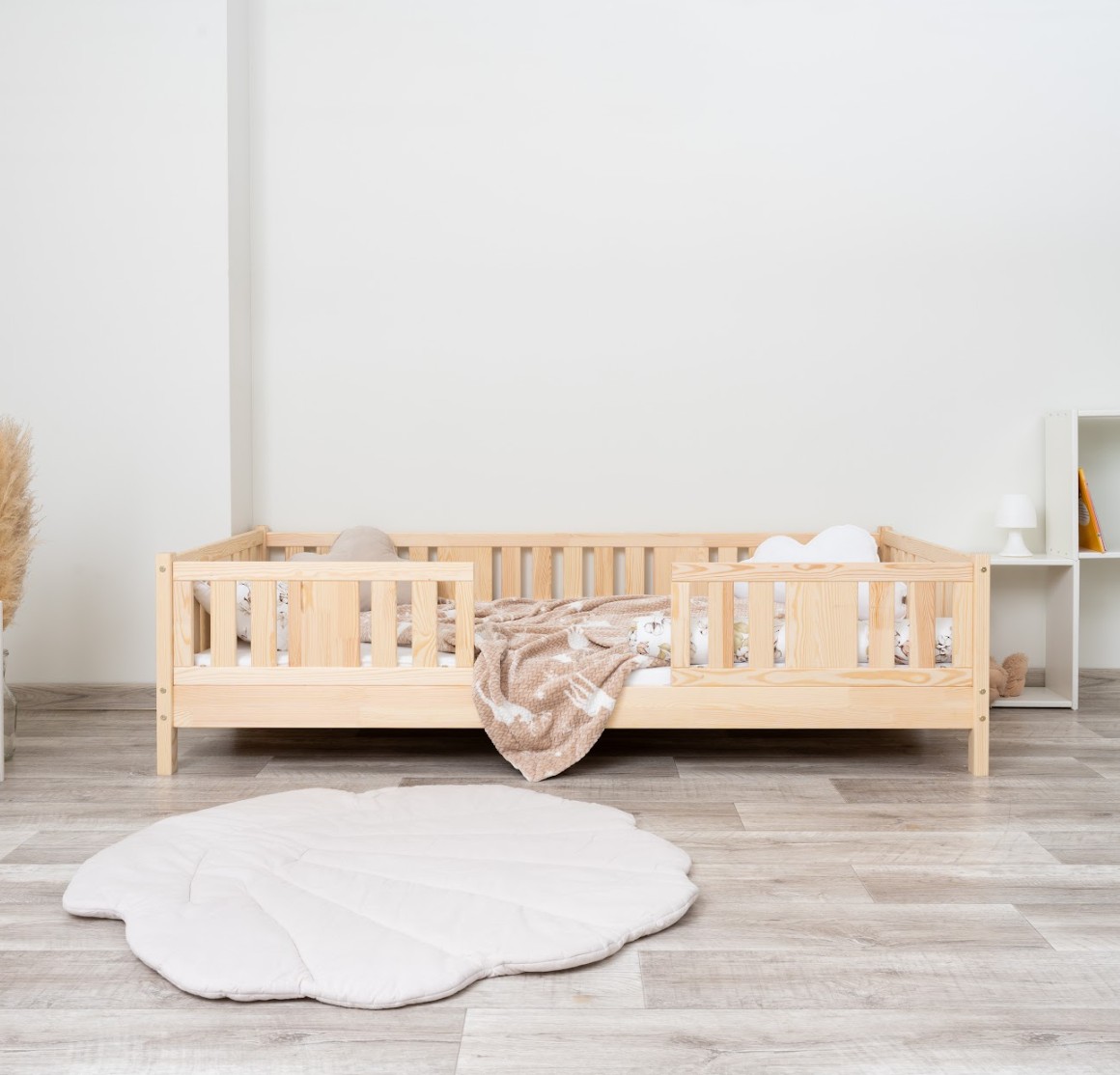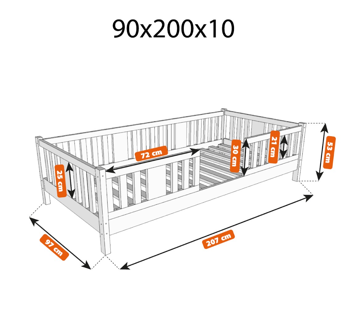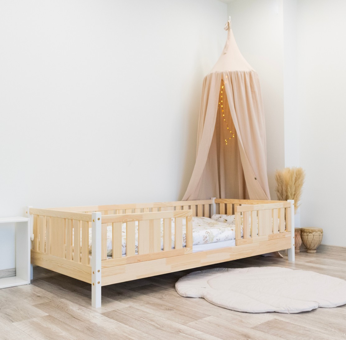 NIKO 10 cm je drevená detská posteľ s vyvýšenou konštrukciou, navrhnutá s ohľadom na pohodlie a praktickosť. Vďaka 10 cm vysokým nohám si posteľ zachováva nízky profil a zároveň umožňuje ľahké čistenie pod ňou. Je to ideálna voľba pre rodičov, ktorí hľadajú bezpečnú, funkčnú a odolnú borovicovú posteľ pre svoje dieťa. Posteľ NIKO 10 je vyrobená výhradne z prírodného borovicového dreva, známeho pre svoju odolnosť a hrejivý, príjemný vzhľad. Všetky prvky sú hladko brúsené a zaoblené, čo zaisťuje úplnú bezpečnosť aj pre najmenšie deti. Povrchová úprava je prevedená ekologickými farbami na vodnej báze, ktoré spĺňajú európsku normu EN 71-3 – bez zápachu, toxínov a škodlivých látok. Vďaka tomu je posteľ NIKO 10 ideálna do izieb alergikov alebo dojčiat. Posteľ ponúkame aj vo verzii bez povrchových úprav - nelakované drevo. Vďaka tomu sa dá ľahko prispôsobiť - jej vzhľad môžete upraviť morením, lakovaním alebo maľovaním podľa vlastného uváženia. Každý prvok rámu bol precízne vyleštený a hrany sú jemne zaoblené, aby bolo zaistené maximálne pohodlie a bezpečnosť. Bezpečnostné zábrany pri vstupe do postele sú odnímateľné.