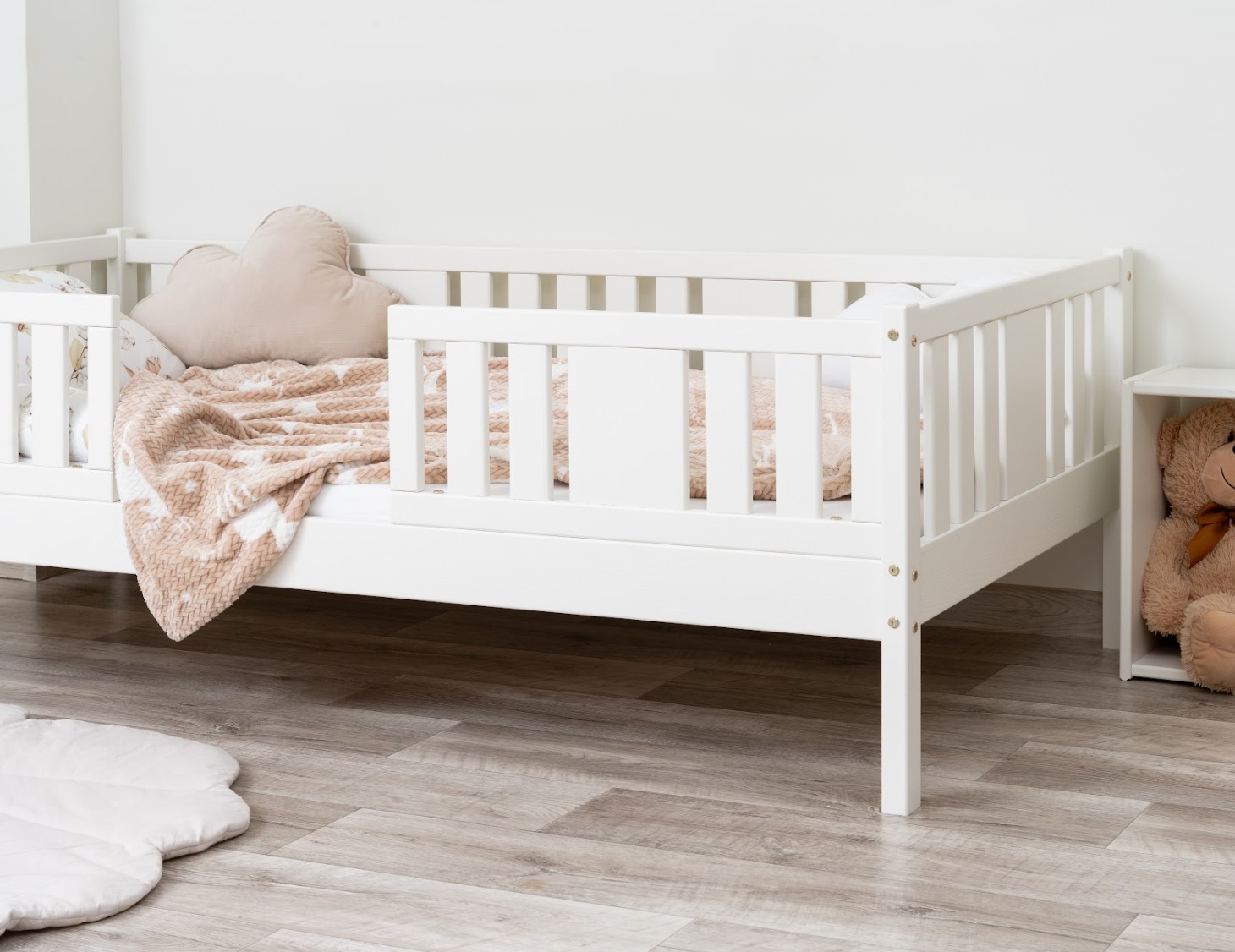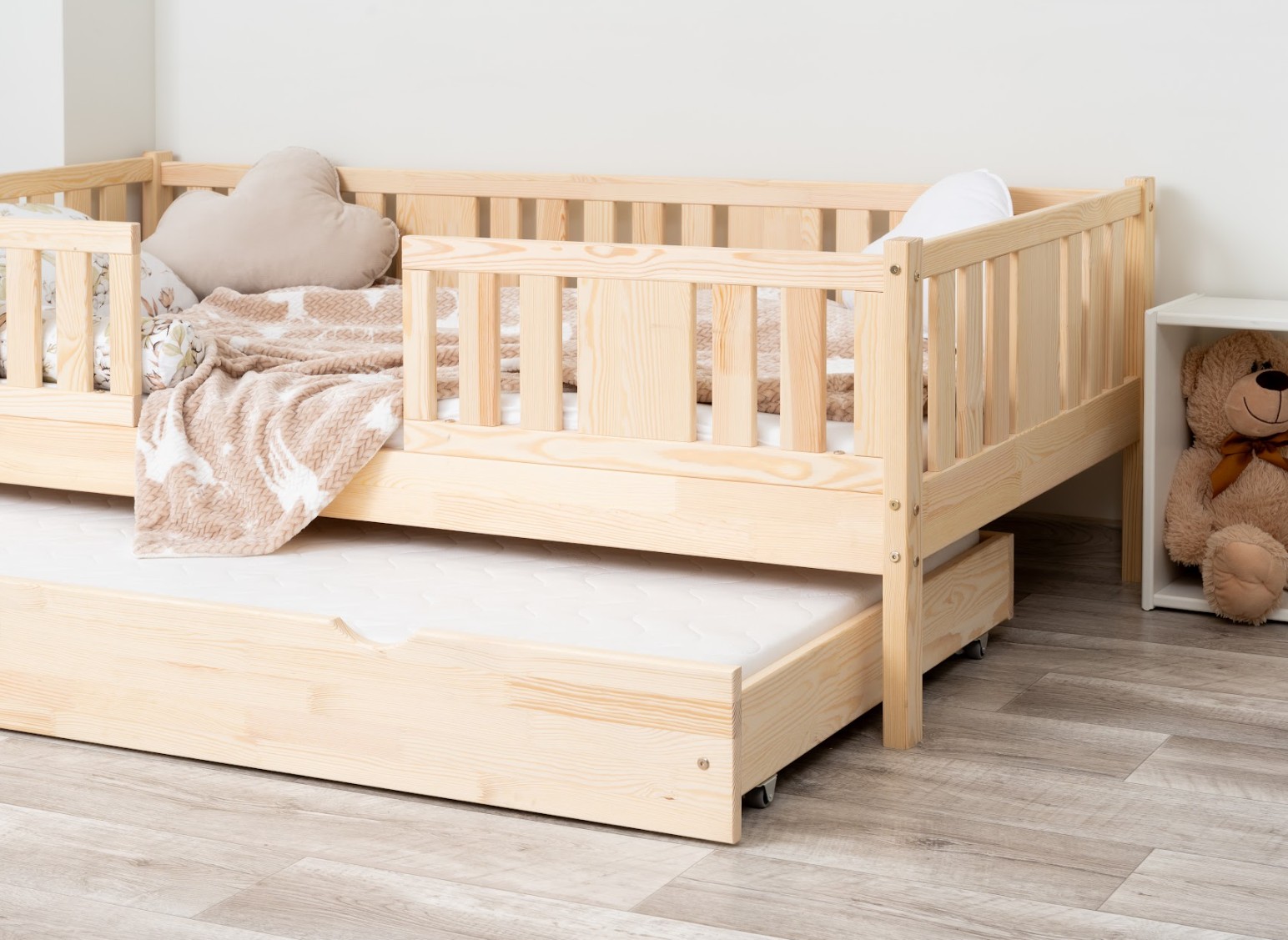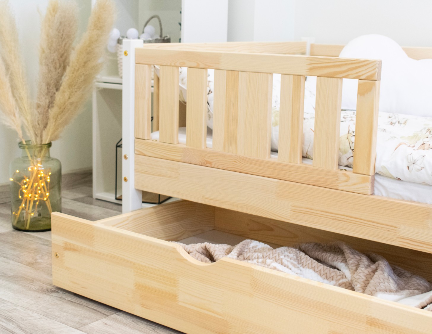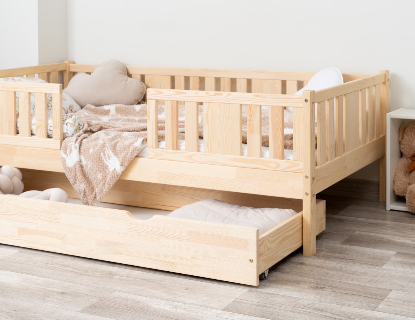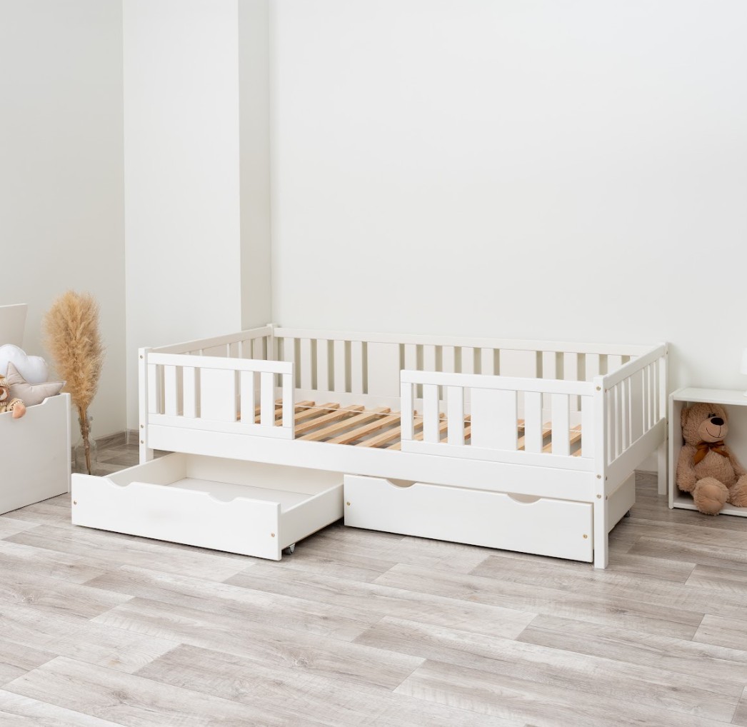 NIKO 20 cm je robustná a esteticky príjemná detská posteľ, vyrobená výhradne z prírodného borovicového dreva. Rám, zvýšený o 20 cm, dodáva jej praktickosti nový rozmer – voliteľnú zásuvku pod posteľou je možné využiť na posteľnú bielizeň, hračky alebo dokonca ako prístelku pre druhé dieťa. Tento model kombinuje škandinávsky štýl, odolné drevo a múdre riešenia pre moderné rodinné interiéry. Každý prvok postele NIKO 20 cm je vyrobený z lepeného borovicového dreva, ktoré je cenené pre svoju odolnosť, stabilitu a prírodný vzhľad. Drevo je starostlivo brúsené a hrany sú jemne zaoblené, takže je úplne bezpečné pre najmladších užívateľov. Na povrchovú úpravu boli použité ekologické farby na vodnej báze, ktoré spĺňajú bezpečnostné normy. Posteľ ponúkame aj vo verzii bez povrchových úprav - nelakované drevo. Vďaka tomu sa dá ľahko prispôsobiť - jej vzhľad môžete upraviť morením, lakovaním alebo maľovaním podľa vlastného uváženia. Každý prvok rámu bol precízne vyleštený a hrany sú jemne zaoblené, aby bolo zaistené maximálne pohodlie a bezpečnosť. Bezpečnostné zábrany pri vstupe do postele sú odnímateľné.