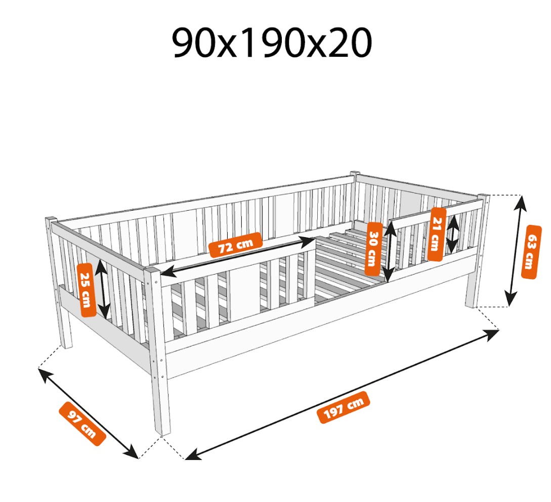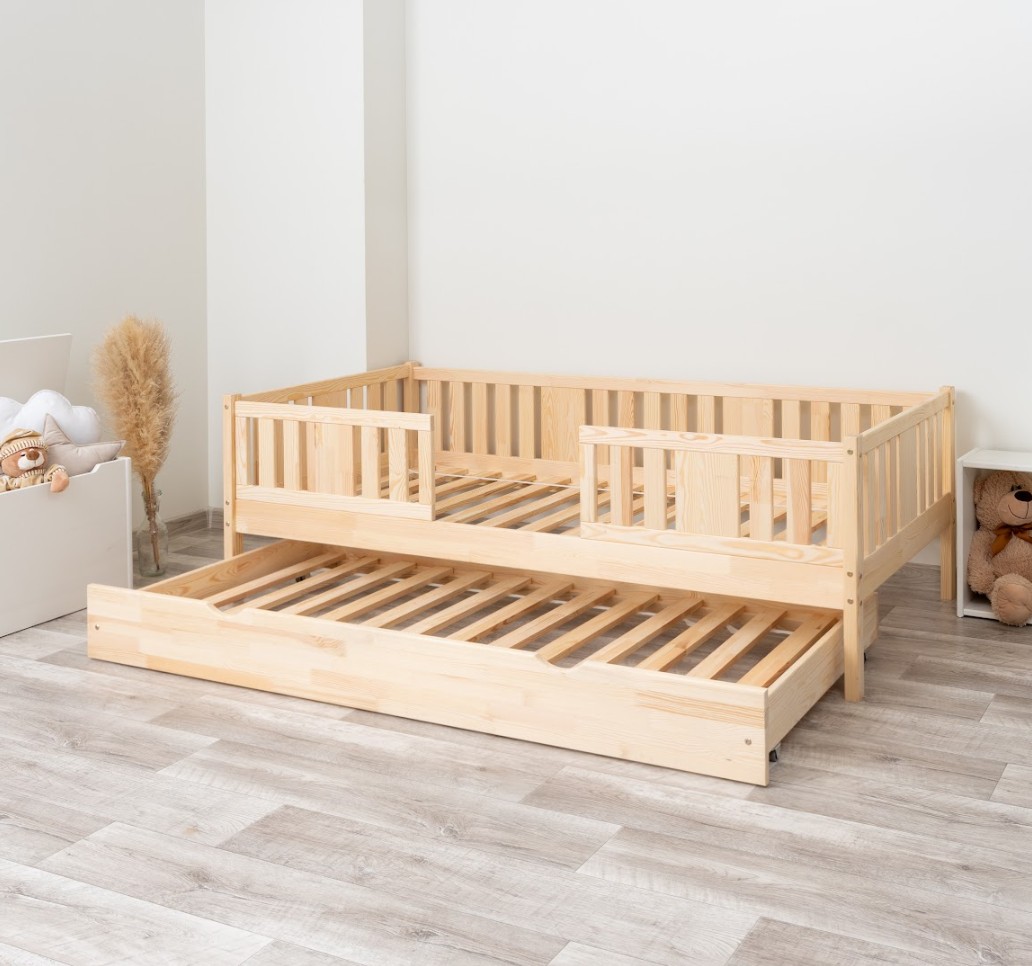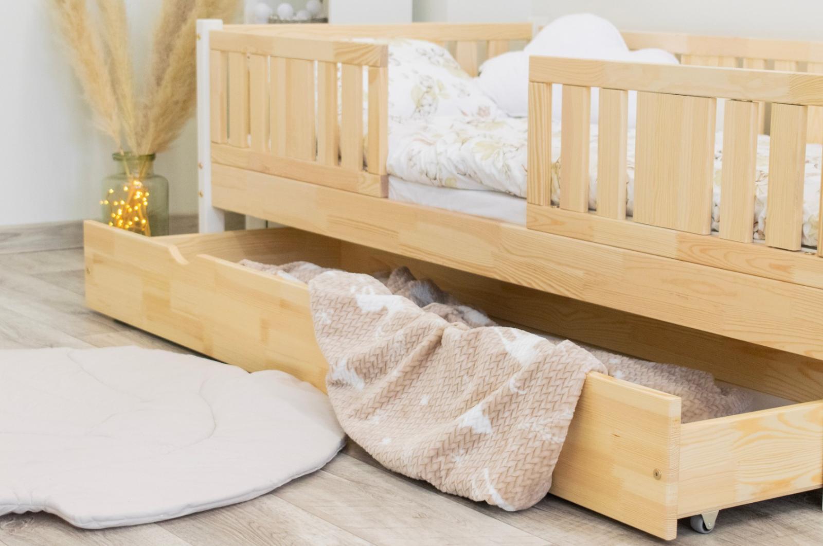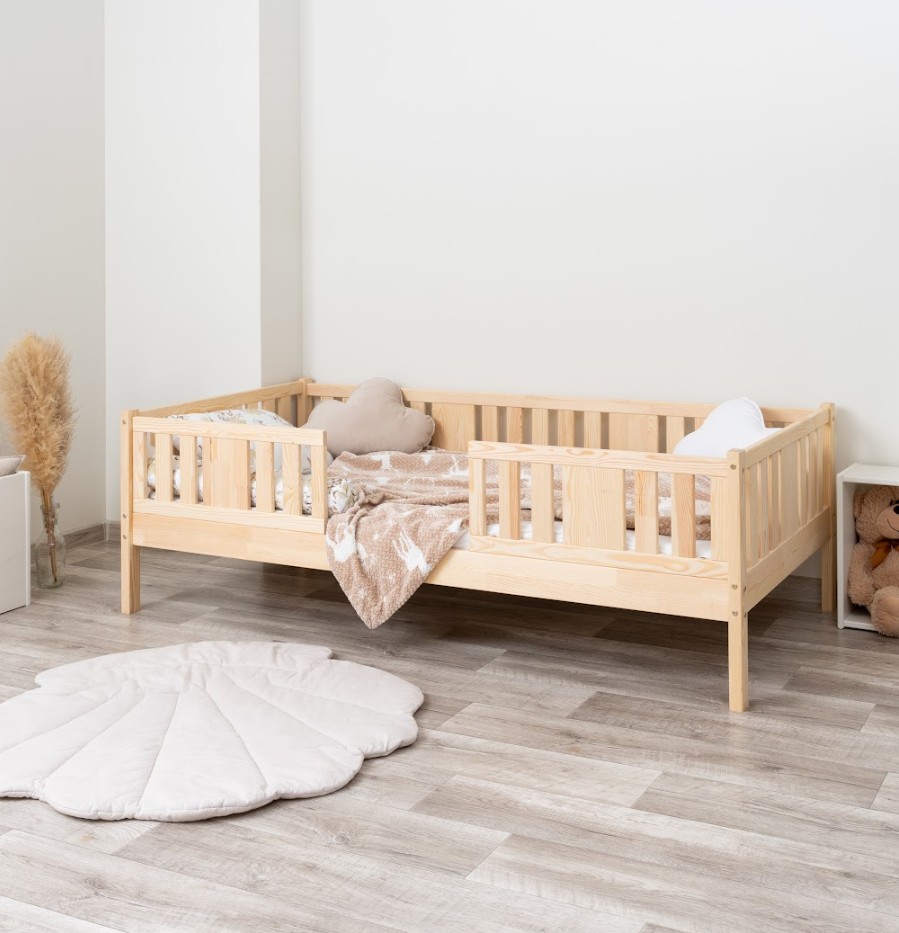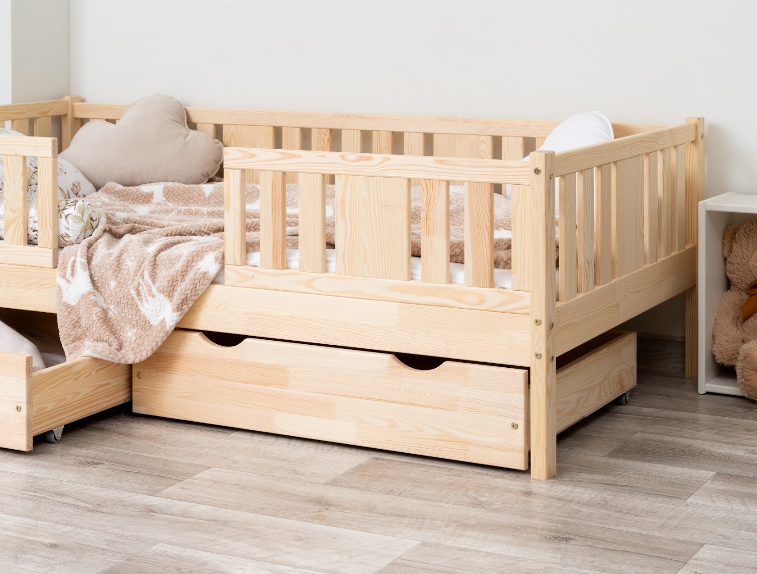 NIKO 20 cm je robustná a esteticky príjemná detská posteľ, vyrobená výhradne z prírodného borovicového dreva. Rám, zvýšený o 20 cm, dodáva jej praktickosti nový rozmer – voliteľnú zásuvku pod posteľou je možné využiť na posteľnú bielizeň, hračky alebo dokonca ako prístelku pre druhé dieťa. Tento model kombinuje škandinávsky štýl, odolné drevo a múdre riešenia pre moderné rodinné interiéry. Každý prvok postele NIKO 20 cm je vyrobený z lepeného borovicového dreva, ktoré je cenené pre svoju odolnosť, stabilitu a prírodný vzhľad. Drevo je starostlivo brúsené a hrany sú jemne zaoblené, takže je úplne bezpečné pre najmladších užívateľov. Na povrchovú úpravu boli použité ekologické farby na vodnej báze, ktoré spĺňajú bezpečnostné normy. Posteľ ponúkame aj vo verzii bez povrchových úprav - nelakované drevo. Vďaka tomu sa dá ľahko prispôsobiť - jej vzhľad môžete upraviť morením, lakovaním alebo maľovaním podľa vlastného uváženia. Každý prvok rámu bol precízne vyleštený a hrany sú jemne zaoblené, aby bolo zaistené maximálne pohodlie a bezpečnosť. Bezpečnostné zábrany pri vstupe do postele sú odnímateľné.