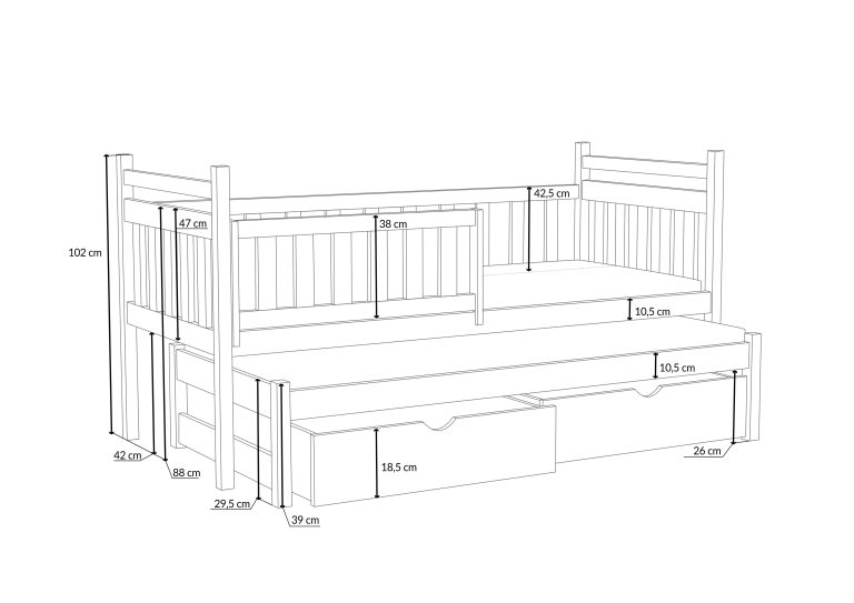 Jednoduchá a solídne vyrobená posteľ s prístelkou Prokop skvele doplní detskú izbu a dodá mu jedinečné útulné kúzlo v minimalistickom prevedení. Zábrany sú navrhnuté tak, aby poskytovali vášmu najmenšiemu maximálne bezpečie. Možnosť vysunutia prístelky je perfektná, ak chcete spať v jeho blízkosti alebo ak máte dve deti zdieľajúce izbu. Posteľ Prokop ponúka funkčné riešenie, ktoré vám umožní ušetriť veľa miesta v detskej izbe. Dve hlboké zásuvky uľahčia udržiavanie poriadku a rozkladacia posteľ je navrhnutá tak, aby poskytovala pohodlie obom osobám používajúcim posteľ, či už sa jedná o súrodenca, kamaráta alebo návštevu. Vysoké opierky hlavy a odnímateľná bezpečnostná zábrana účinne ochránia dieťa pred pádom. Posteľ je vyrobená z kvalitného masívneho borovicového dreva. U bočníc a čiel je šírka použitého materiálu 2,6 cm . Poskytuje vysokú nosnosť a odolnosť proti poškodeniu, vďaka čomu je posteľ Prokop investíciou na mnoho rokov. Posteľ je ošetrená ekologickým lakom na vodnej báze, ktorý posteľ chráni pred poškodením a poškriabaním. Posteľ je dodávaná vrátane kvalitných roštov .