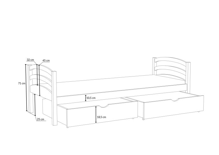 Posteľ Tornado sa vyznačuje jednoduchou a ľahkou konštrukciou, ktorá je ale zároveň pevná a stabilná. Posteľ Tornado nezahltí detskú izbičku a jej skvelé spracovanie z tých najkvalitnejších materiálov zaistí, že bude slúžiť dlhé roky. Drevená posteľ z masívneho borovicového dreva sa vyznačuje vysokou odolnosťou proti poškodeniu a nosnosťou až 120 kg. U bočníc a čiel je šírka použitého materiálu 2,6 cm . Má vysoké opierky hlavy, špeciálne zaoblené, aby bola zaistená bezpečnosť detí, a dve priestranné zásuvky , kam pohodlne uložíte lôžkoviny alebo hračky. Nábytok je pokrytý ekologickým lakom na vodnej báze bez zápachu, ktorý je zdravotne nezávadný. Súčasťou postele je aj pevný latkový rošt .
