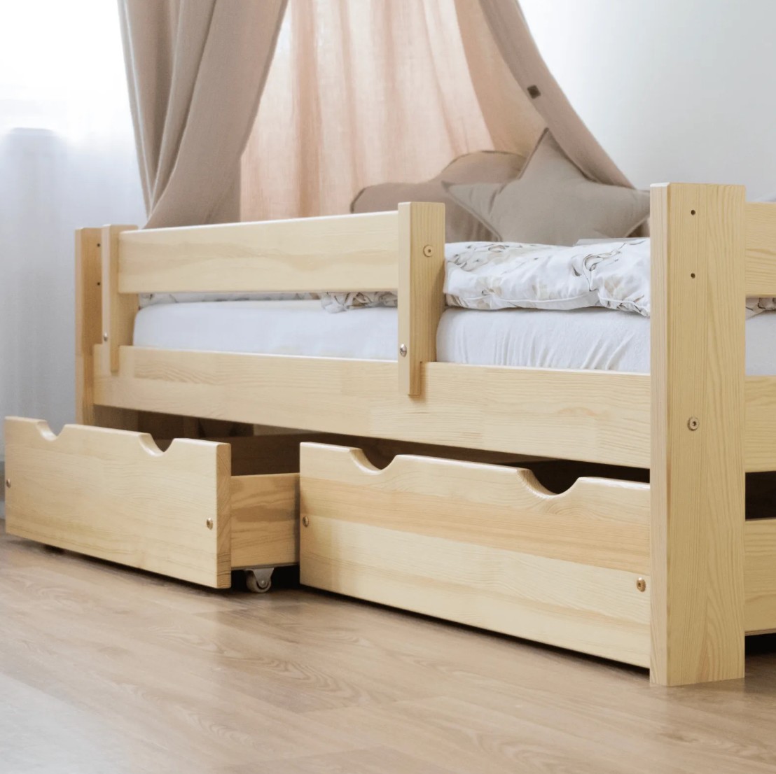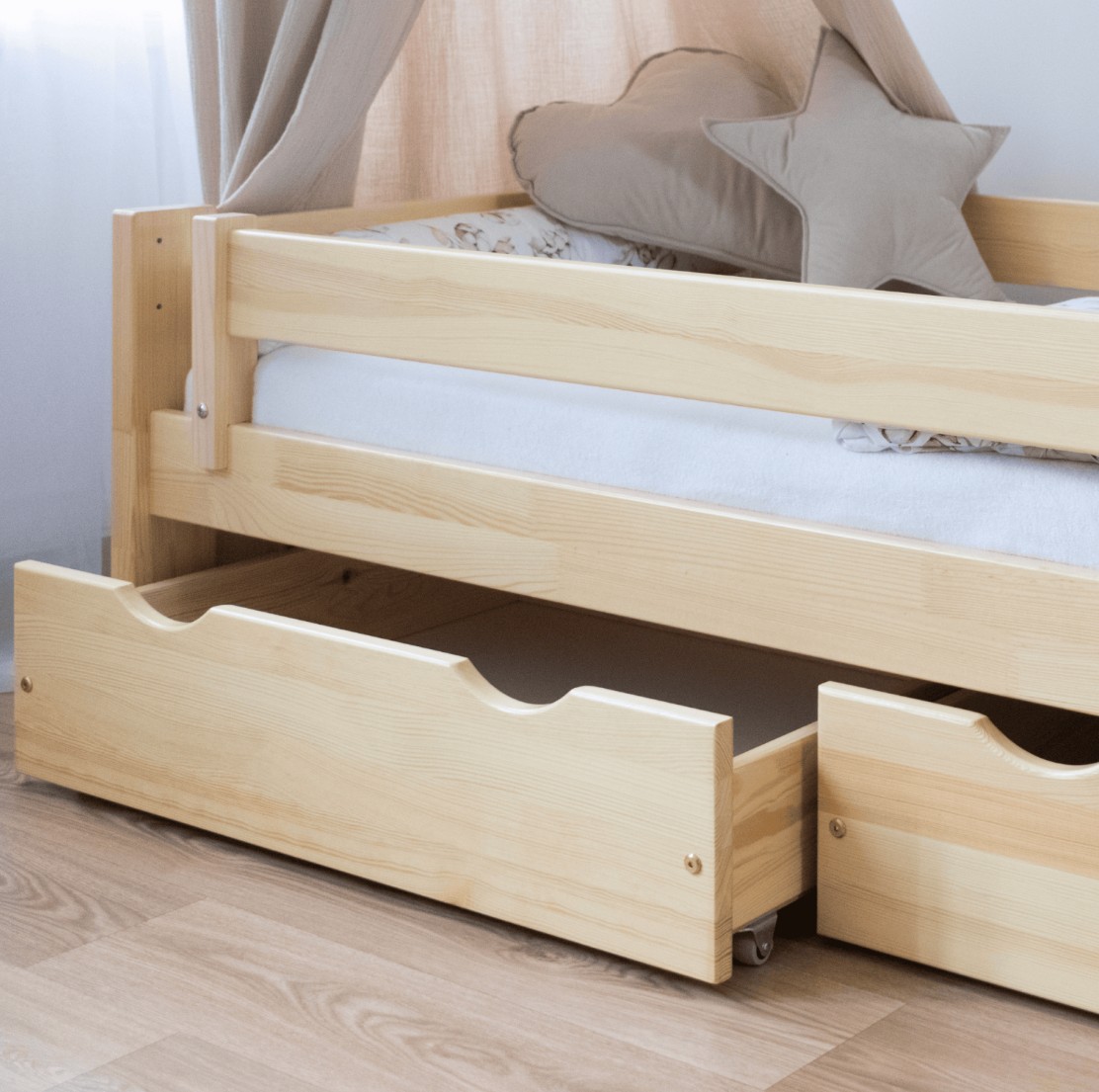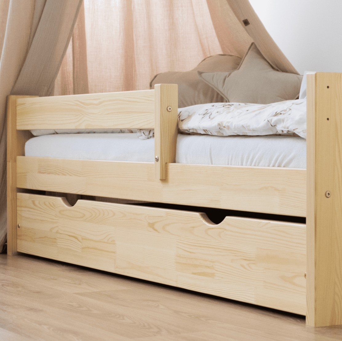 Táto detská posteľ je vytvorená tak, aby ušetrila priestor v detskej izbe. K posteli možno tiež dokúpiť praktický a priestranný šuplík z masívu v niekoľkých variantoch a rôznych farbách: