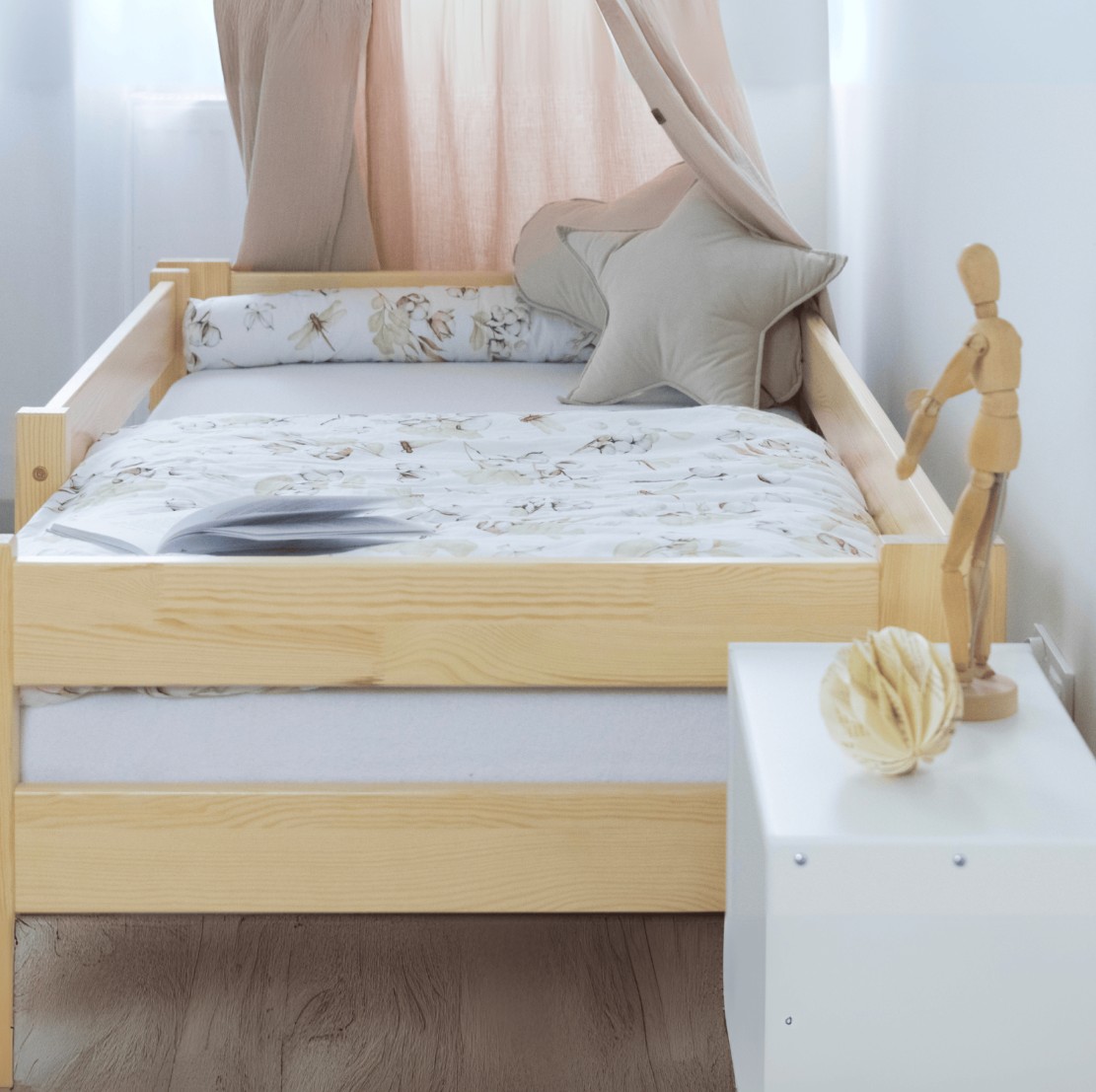 Posteľ je vyrobená z vysoko kvalitného borovicového dreva so zvýšenou nosnosťou až na 100 kg. Konštrukcia postele je prispôsobená tak, aby zabránila pádu dieťaťa, a to vďaka ochranným bariéram. Vaše dieťa sa tak bude cítiť v pokoji a bezpečí. Súčasťou postele je pevná ochranná zábrana, ktoré môžu byť namontované na čelo postele tak z pravej strany, tak aj z ľavej strany. Detská posteľ zaujme svojím krásnym vzhľadom a vytvára tak komplexný prvok, ktorý sa bude vynímať v každej detskej izbe.