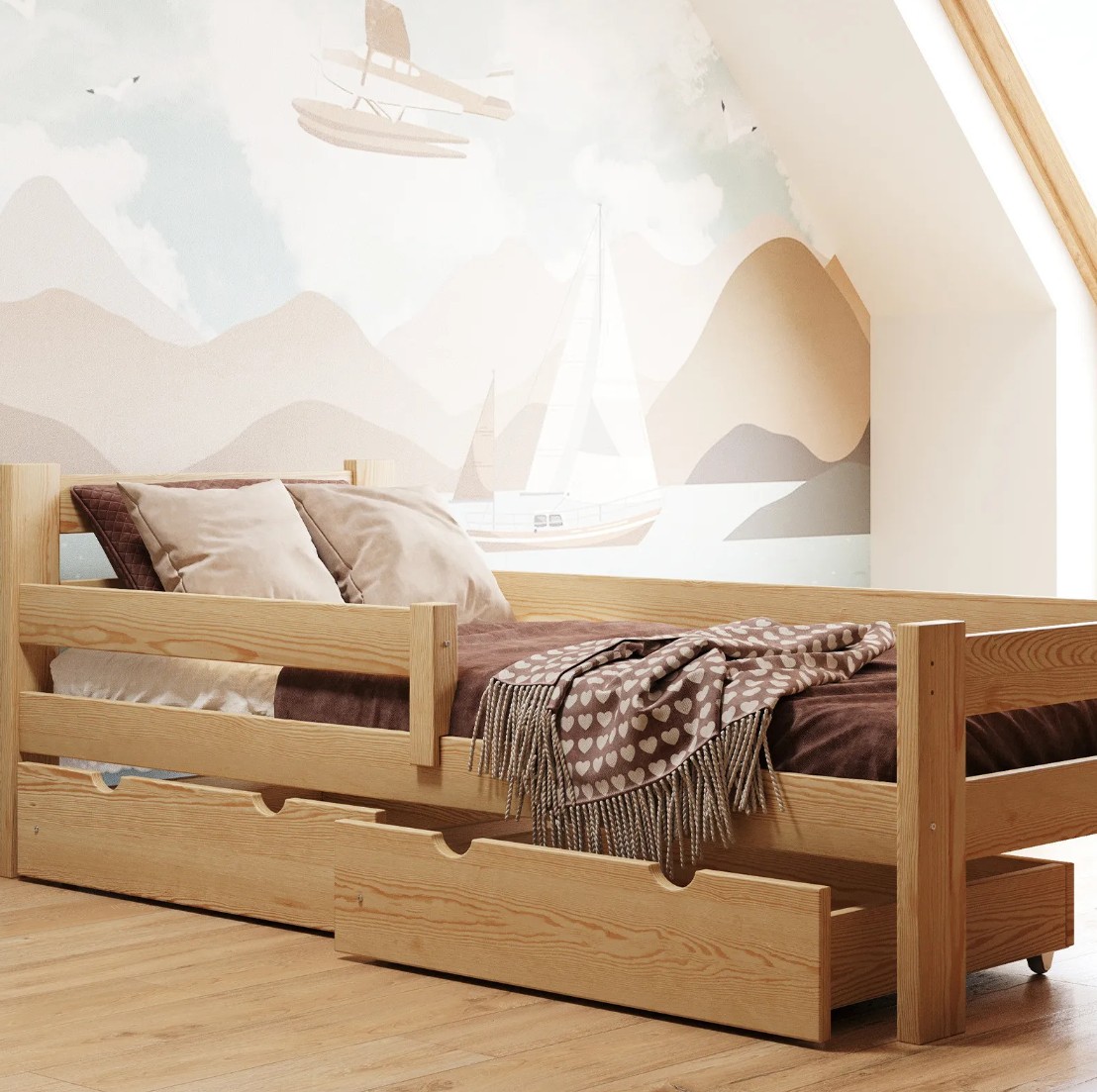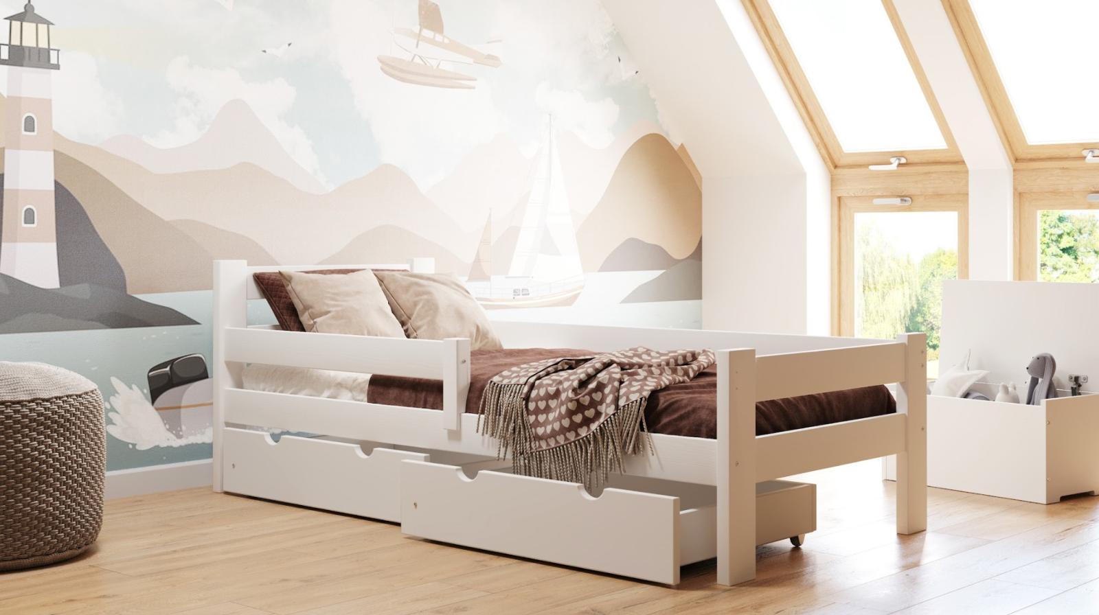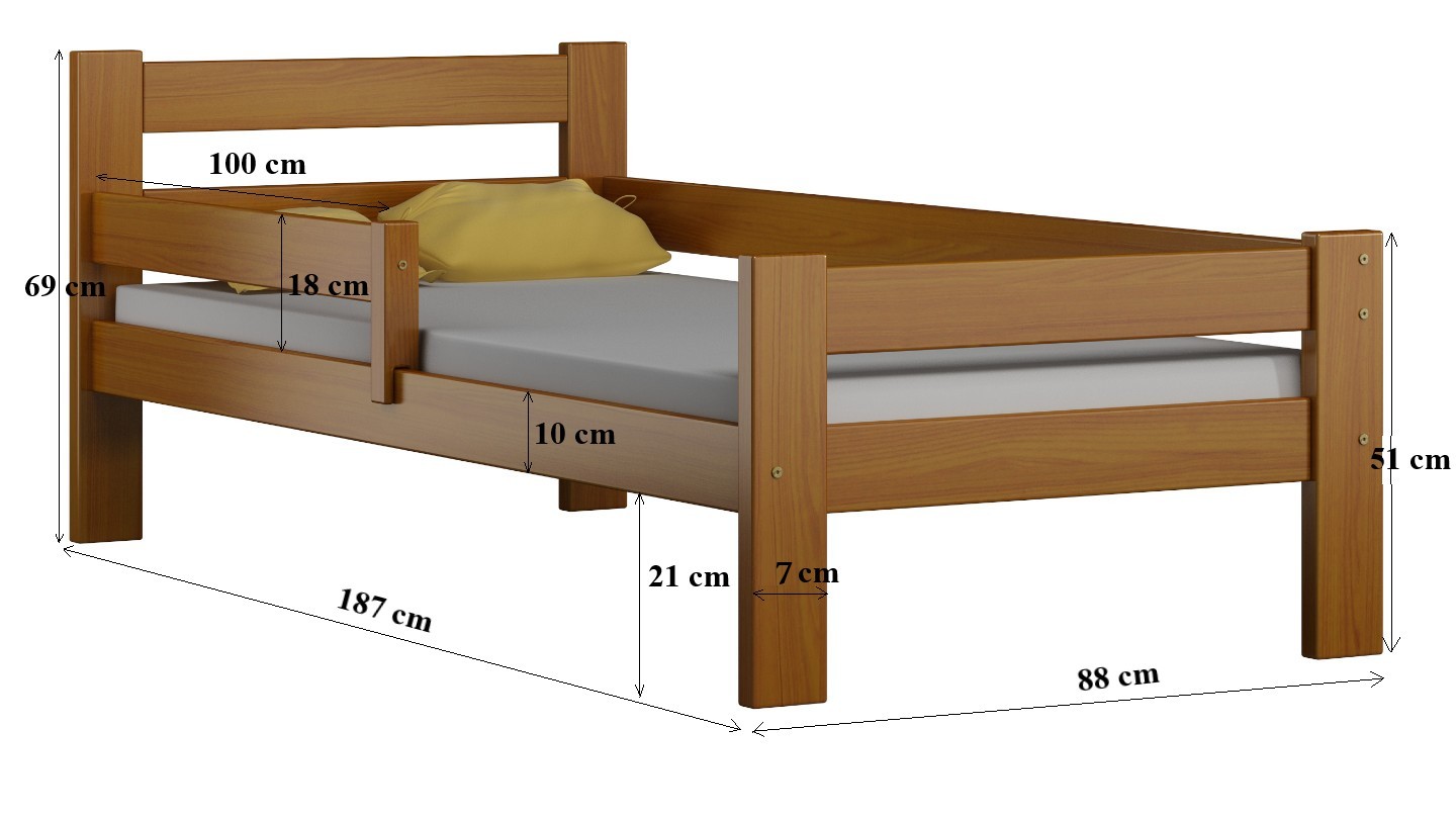 Posteľ je vyrobená z vysoko kvalitného borovicového dreva so zvýšenou nosnosťou až na 100 kg. Konštrukcia postele je uspôsobená tak, aby zabránila pádu dieťaťa, a to vďaka ochranným bariéram. Vaše dieťa sa tak bude cítiť v pokoji a bezpečí. Súčasťou postele je pevná ochranná bariéra , ktorá je možné namontovať na čele postele ako z pravej strany, tak aj z ľavej strany. Detská posteľ zaujme svojim krásnym vzhľadom a vytvára tak komplexný prvok, ktorý sa bude vynímať v každej detskej izbe.