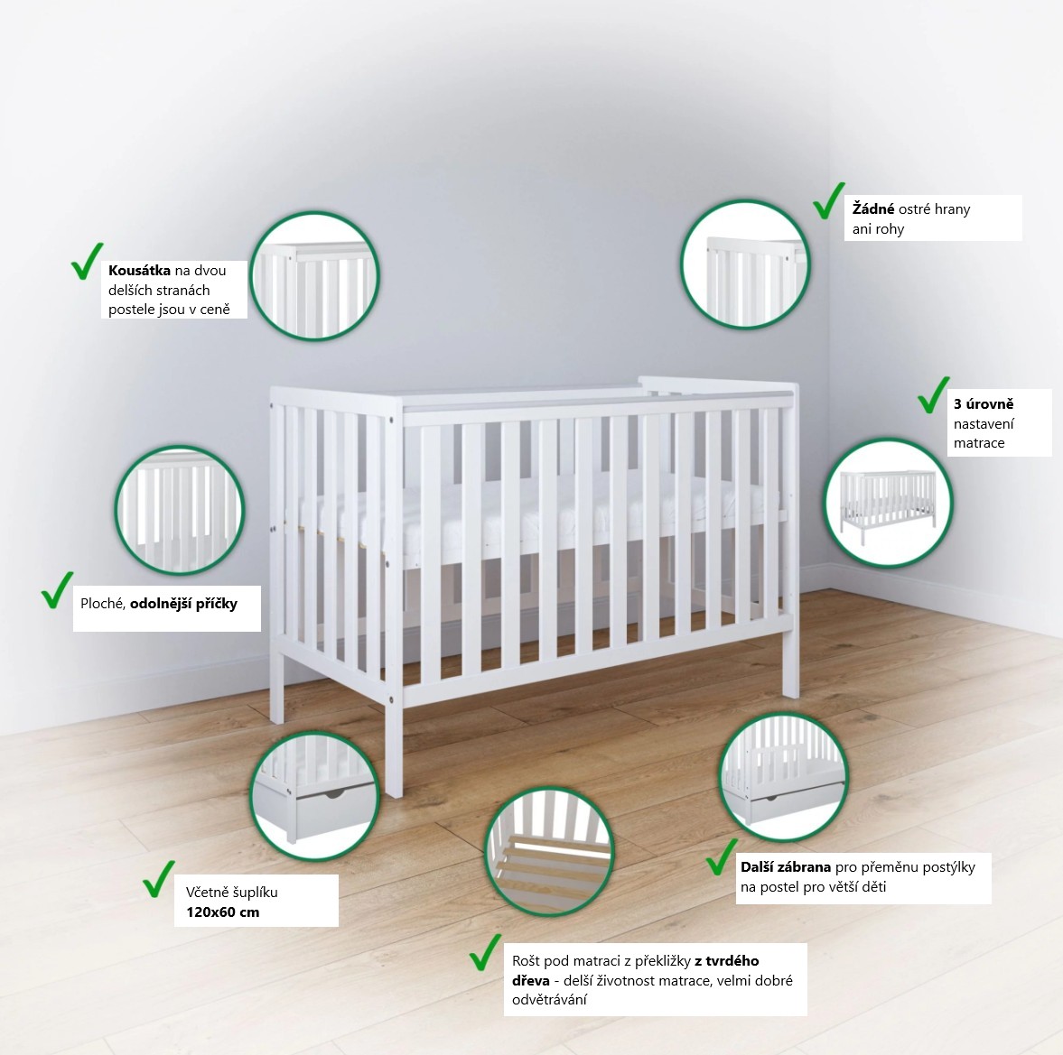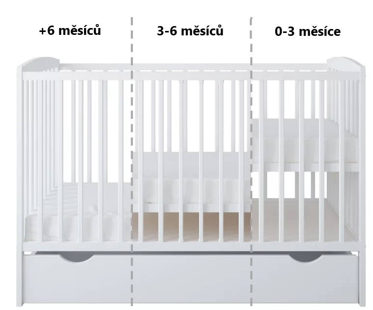 Vďaka trojpolohovému nastaveniu výšky sa detská postieľka Little Bambi prispôsobí veku a vývojovej fáze dieťaťa – od novorodenca, cez sediace batoľa, až po dieťa, ktoré sa učí samostatne stáť. Dve odnímateľné priečky umožňujú bezpečné vystúpenie z postieľky, keď je vaše dieťa pripravené na väčšiu samostatnosť. Lamely roštu umožňujú voľnú cirkuláciu vzduchu, čím podporujú hygienu a zachovávajú vlastnosti matraca. Súčasťou postieľky je aj bezpečnostná zábrana, ktorá umožňuje ľahkú transformáciu detskej postieľky Little Bambi na praktickú dennú postieľku – ideálnu pre staršie dieťa, ktoré už nepotrebuje plné bezpečnostné prvky. Detská postieľka Little Bambi je vyrobená z MDF (dlhé aj krátke priečky), zatiaľ čo rošt pod matrac je vyrobený z preglejky z tvrdého dreva – pevného, pružného a deformačne odolného materiálu. Rošt postieľky je možné nastaviť do troch úrovní. Najvyššia úroveň (0-3 mesiace) je určená pre novorodencov a uľahčuje rodičom každodennú starostlivosť. Stredná úroveň (3-6 mesiacov) je vhodná, keď dieťa začína sedieť, a najnižšia úroveň (6 mesiacov a staršia) je vhodná, keď dieťa už stojí, a chráni ho tak pred vypadnutím z postieľky. Celá konštrukcia vytvára stabilný a bezpečný základ pre spánok vášho dieťaťa. Široké obdĺžnikové priečky sú pohodlnejšie a funkčnejšie ako tradičné tenké prvky – poskytujú vášmu dieťaťu pevnejšiu oporu, keď sa učia stáť, a ich tvar zvyšuje pohodlie a bezpečnosť. Tento model je dodávaný v elegantnej bielej farbe, ktorá dodáva interiéru nádych ľahkosti a harmónie a hodí sa k mnohým designom detských izieb. Postieľka je dodávaná vrátane praktického šuplíka na kolieskach. Matrac nie je súčasťou.