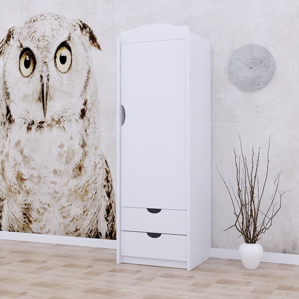 Oblečenie a doplnky pohodlne vášmu dieťaťu upracete do detskej šatníkovej skrine. Zvoľte napríklad tú s šatníková tyčí a dvoma šuplíky dole. Jednoduchý dizajn, kedy sa biela kombinuje s farebnými dvierkami, soklom a čelom hore vhodne doplní každý detskú izbu. Zvoliť si môžete zo šiestich farieb a tiež ľavú alebo pravú variantu. Celá skriňa je vyrobená z 18mm laminovanej dosky. Okraje sú ukončené okrajom z PVC / ABS, ktorý ich chráni pred mechanickým poškodením a vlhkosťou. Namiesto rúčok slúži na otváranie šuplíkov a skriniek oblúkové výrezy.