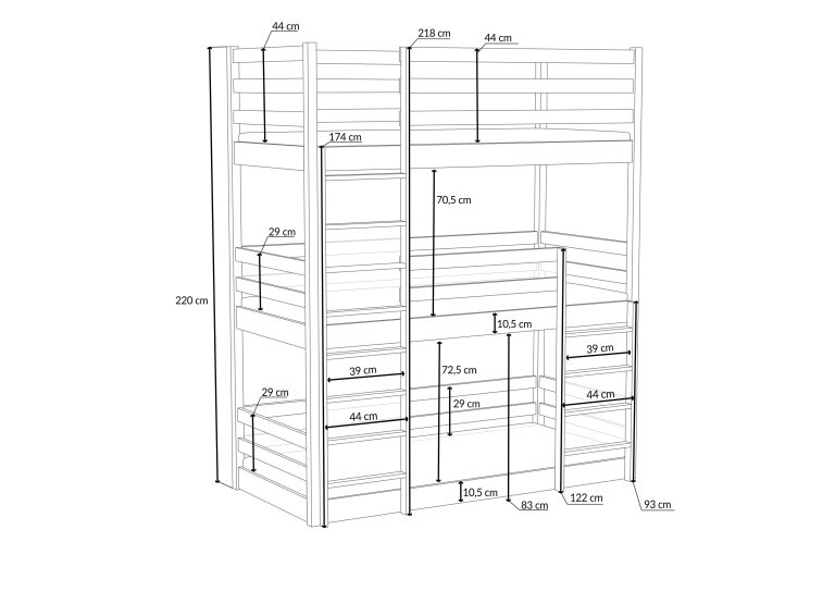 Trojposchodová posteľ Arizona je perfektnou voľbou pre tri deti. Posteľ Arizona bola vytvorená pre rodičov troch detí, ktorí chcú prakticky využiť priestor v detskej izbe. Pri výbere postele Arizona vám stačí jeden kus nábytku, aby každé vaše dieťa malo pohodlné miesto na spanie. Získate tak voľný priestor, ktorý môžete využiť akýmkoľvek spôsobom! Posteľ je vyrobená z masívneho borovicového dreva , ktoré zaisťuje odolnosť konštrukcie a hypoalergénny lak na vodnej báze posteľ chráni pred poškodením a poškriabaním. U bočníc a čiel je šírka použitého materiálu 2,6 cm. Spodné lôžko je vďaka svojej nízkej konštrukcii vhodné aj pre najmenšie deti, do vyvýšených poschodí vedú samostatné rebríky , ktoré umožnia ľahký prístup väčším deťom. Minimalistický dizajn a funkčnosť umožňujú praktické využitie priestoru v detskej izbe. Posteľ je dodávaná vrátane kvalitných roštov .