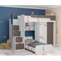 Stabilná vyvýšená posteľ poskytuje dostatok miesta na spánok a odpočinok vašich detí a zároveň ponúka množstvo úložného priestoru . Súčasťou postele sú schodíky , ktoré umožňujú prístup k hornému lôžku. Každý zo schodíkov je tiež úložným priestorom s výklopnými dvierkami , kam si vaše deti môžu ukladať svoje hračky a iné nevyhnutnosti. Schodíky sú univerzálne , možno ich umiestniť na pravú či ľavú stanu postele. Priestor pod horným lôžkom je vybavený policou na odkladanie vecí, ktoré tak môžu mať deti hneď po ruke, spodnou posteľou pre súrodencov, kamaráta alebo návštevu a priestrannou šatníkovou skriňou . V šatníkovej skrini je jedna polica a šatníková tyč, ale v prípade záujmu je možné dokúpiť 3 kusy políc a tým vytvoriť ešte viac priestoru na ukladanie odevov.