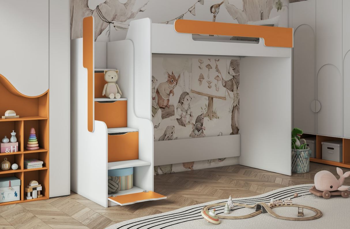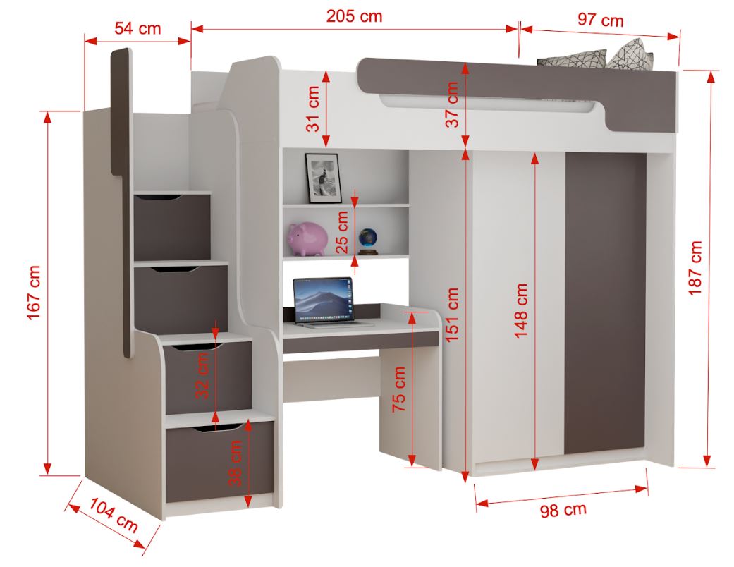 Stabilná vyvýšená posteľ poskytuje dostatok miesta na spánok a odpočinok vašich detí a zároveň ponúka množstvo úložného priestoru . Súčasťou postele sú schodíky , ktoré umožňujú prístup k hornému lôžku. Každý zo schodíkov je tiež úložným priestorom s výklopnými dvierkami , kam si vaše deti môžu ukladať svoje hračky a iné nevyhnutnosti. Schodíky sú univerzálne , možno ich umiestniť na pravú či ľavú stanu postele. Priestor pod horným lôžkom je vybavený policou na odkladanie vecí, ktoré tak môžu mať deti hneď po ruke, písacím stolom a priestrannou šatníkovou skriňou . V šatníkovej skrini je jedna polica a šatníková tyč, ale v prípade záujmu je možné dokúpiť 3 kusy políc a tým vytvoriť ešte viac priestoru na ukladanie odevov.