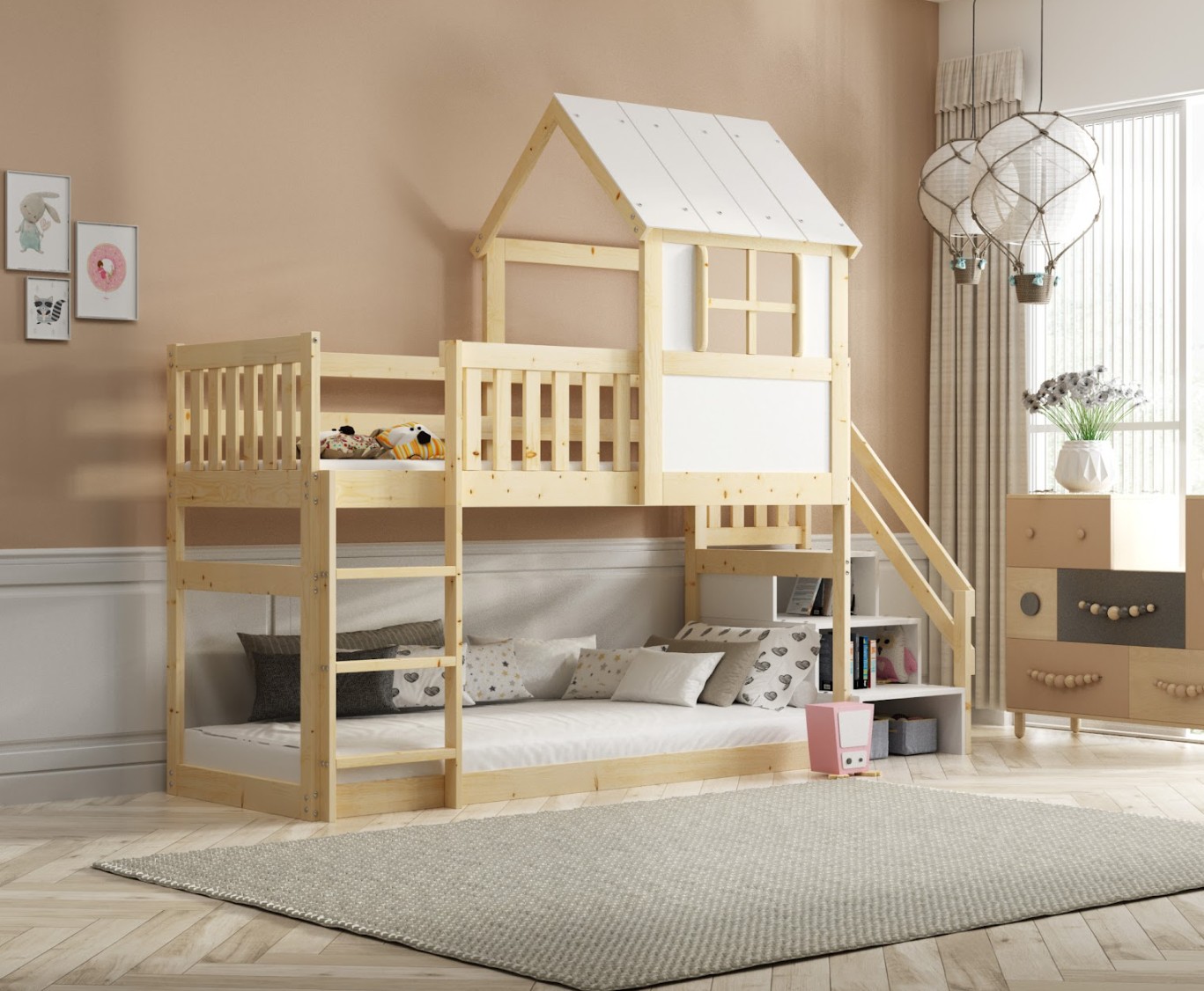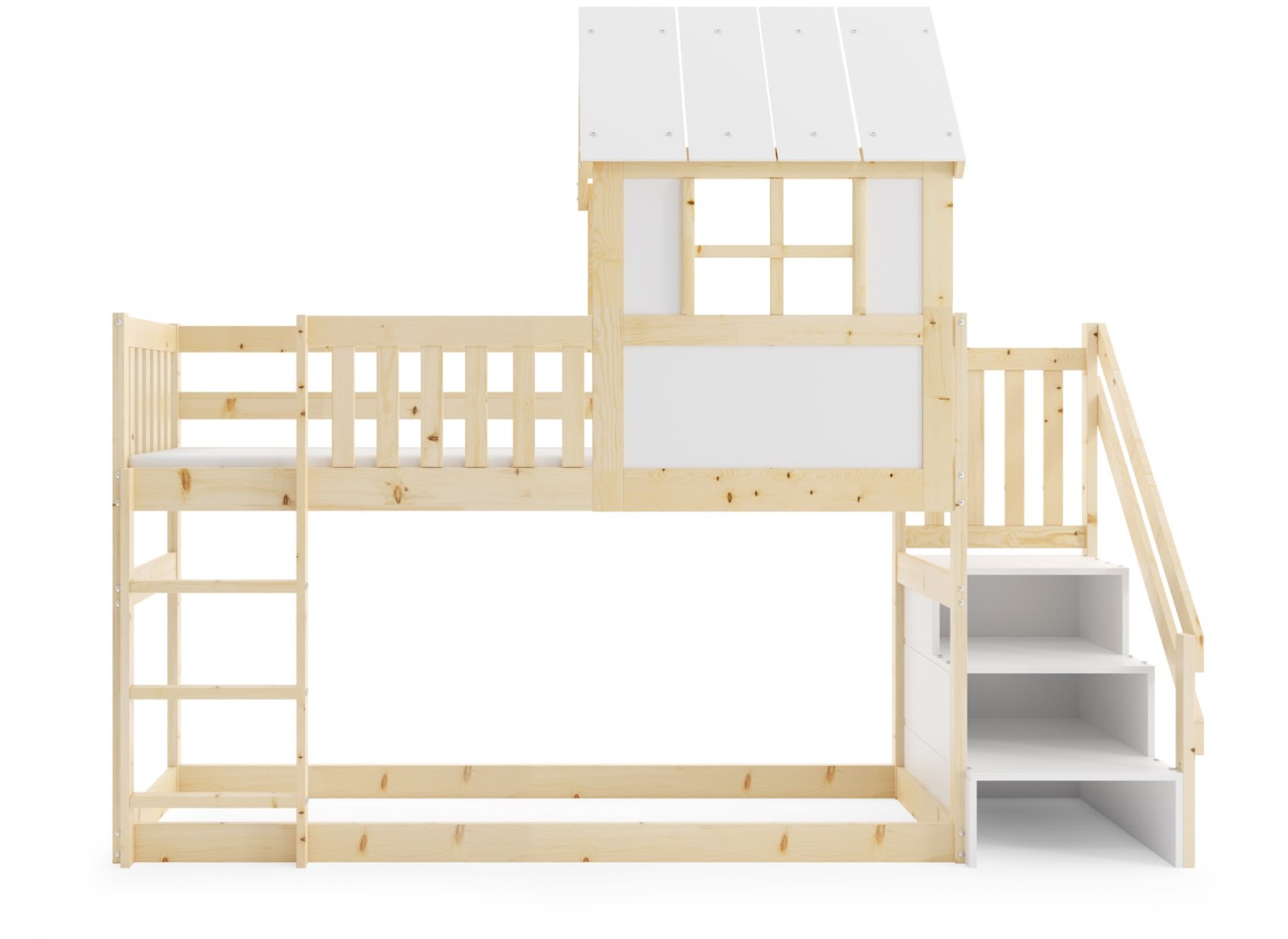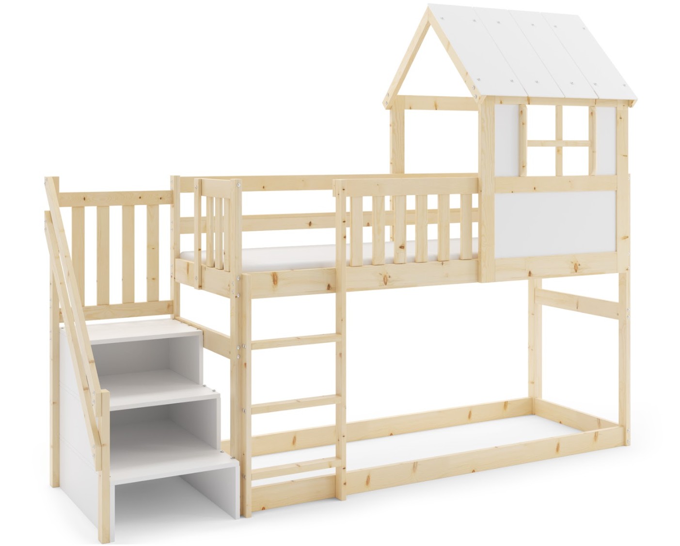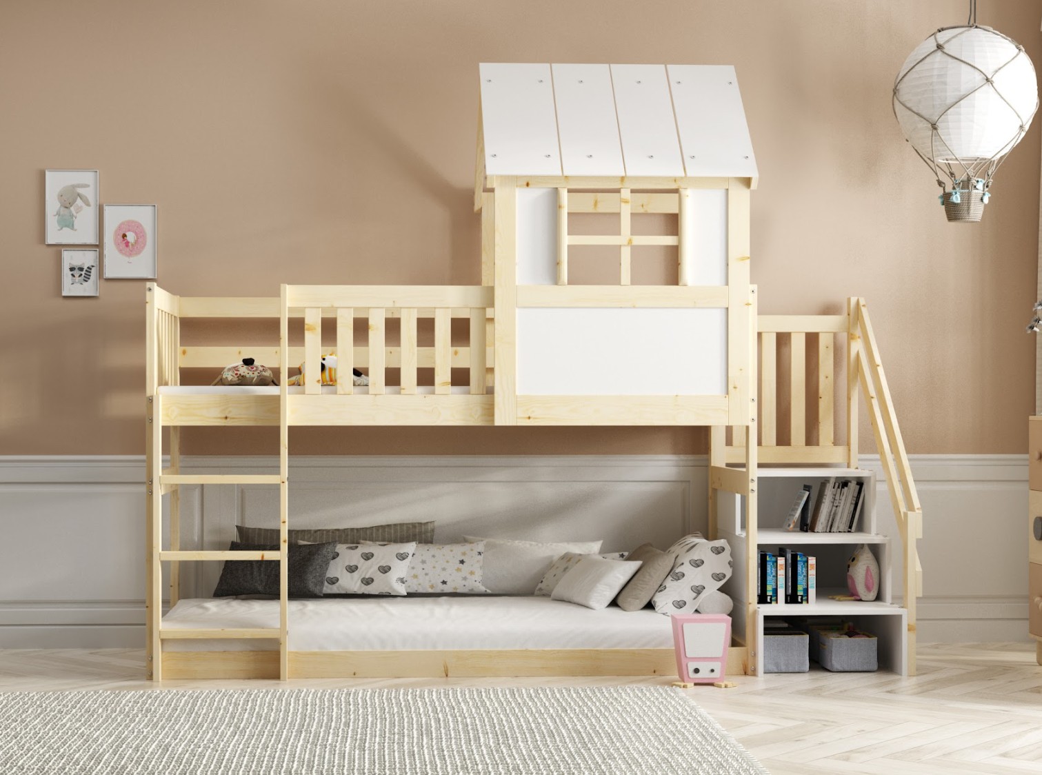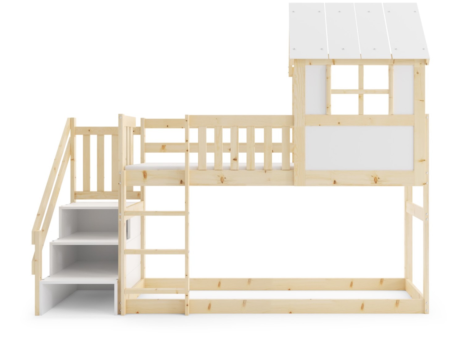 Detská vyvýšená posteľ ALTURA vám pomôže maximalizovať priestor detskej izby. Nielen, že krásne vyzerá a navodí príjemnú atmosféru, ale taktiež zaručí pohodlie a dobrý spánok. Vďaka tejto posteli môžete aj v malej miestnosti vytvoriť jedinečný priestor, ktorý splní všetky potreby a zaujme svojim jedinečným štýlom. Minimalistický, škandinávsky štýl postele Altura osloví všetkých ľudí, ktorí oceňujú modernosť a funkčnosť. Neutrálna farba postele sa hodí do chlapčenských i dievčenských izieb, kde sa stane dominantným prvkom. Rám postele je vyrobený z kvalitného masívneho borovicového dreva bez povrchových úprav, čo ponúka prirodzený vzhľad. Posteľ je ekologická, odolná a dá sa ľahko prispôsobiť - jej vzhľad môžete upraviť morením, lakovaním alebo maľovaním podľa vlastného uváženia. Vďaka vysokým zábranám je zaistená bezpečnosť dieťaťa počas spánku. Posteľ je dodávaná s rebríkom , ktorého montáž je možná na pravú aj ľavú stranu postele. Široké nášľapy zaručujú jednoduchý prístup na lôžko. Ďalšími doplnkami postele sú domček a schodíky , ktoré dodávajú posteli originálny vzhľad a atraktivitu. Domček navodí útulnú atmosféru a zároveň slúži ako ochranná bariérka proti vypadnutiu počas spánku. Schodíky s úložnými priestormi poslúžia nielen na jednoduchší prístup na horné lôžko, ale aj na ukladanie kníh, hračiek alebo dekorácií. Schodíky je možné umiestniť na pravú aj ľavú stranu. Konštrukcia postele je veľmi stabilná a vďaka zaobleným hranám sa stane bezpečným miestom na hranie, spánok aj relaxáciu vášho dieťaťa. Posteľ je dodávaná vrátane roštu pre horné lôžko. Priestor pod posteľou je možné využiť na hranie alebo ako ďalšie miesto na spánok s princípmi Montessori lôžka, kedy je umožnený voľný vstup aj výstup z postele. Rošt na spodné lôžko nie je súčasťou postele, je možné použiť matrac bez roštu. Vďaka nižšej konštrukcii je posteľ vhodná aj pre menšie deti.